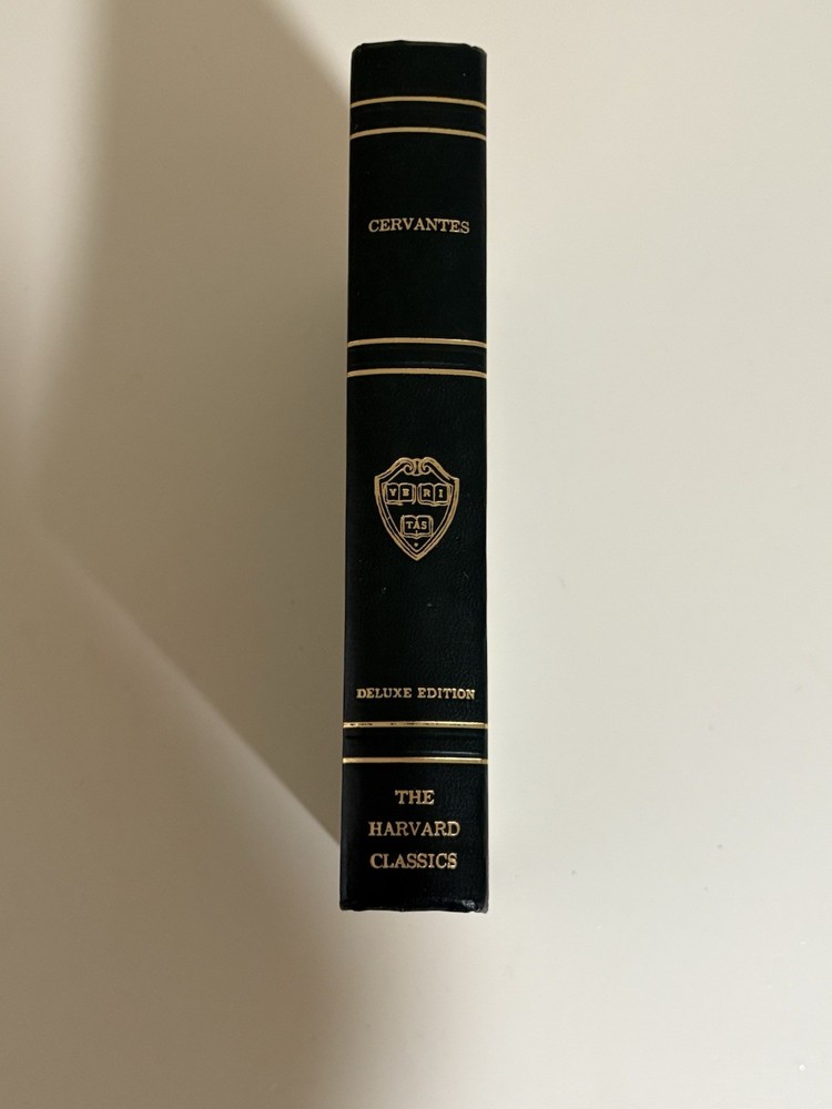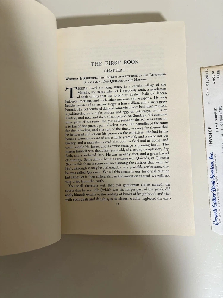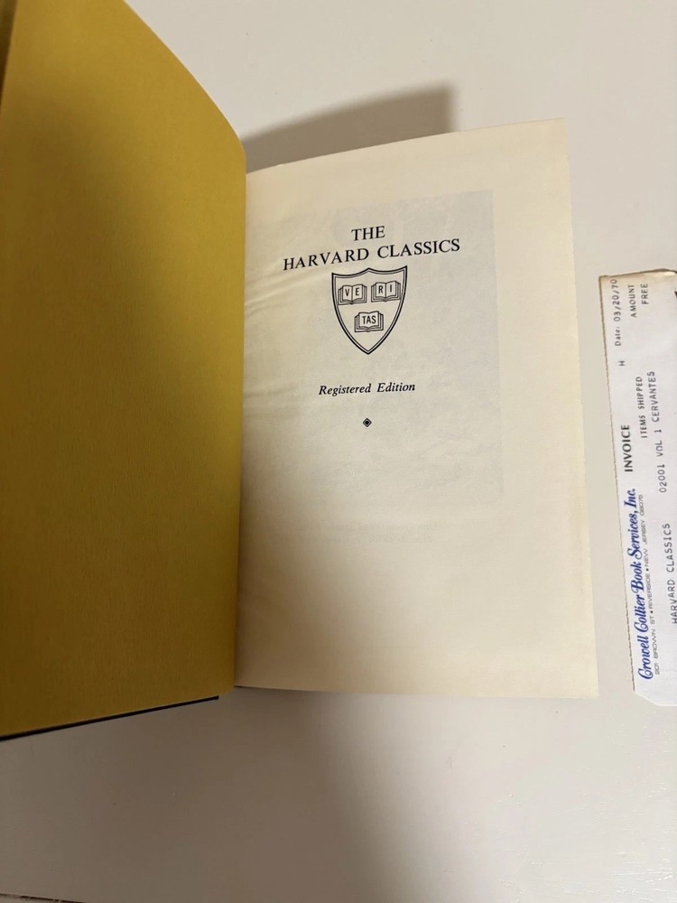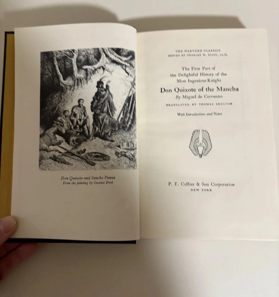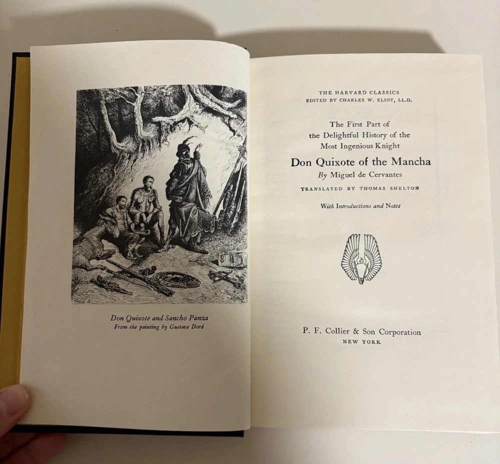 This is a Deluxe Edition of Don Quixote of the Mancha by Miguel de Cervantes, Volume 1 from The Harvard Classics series. Translated by Thomas Shelton and edited by Charles W. Eliot, LL.D. • Publisher: P.F. Collier & Son Corporation, New York • Binding: Deluxe faux leather hardcover in black with gold-embossed spine and cover detailing • Edition: Harvard Classics Deluxe Edition • Volume: Vol. 1 – Cervantes (Don Quixote) • Bonus: Includes original invoice from Crowell-Collier Book Services, dated 1970 • Illustration: Frontispiece image of Don Quixote and Sancho Panza from a painting by Gustave Doré Condition: • Excellent vintage condition • Crisp, clean pages • Binding tight • Light handling wear on cover • Invoice has minor age-related staining