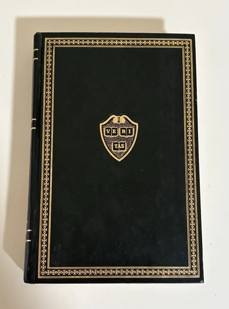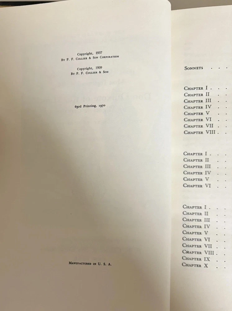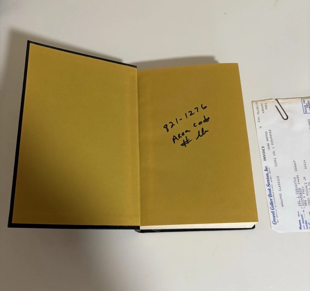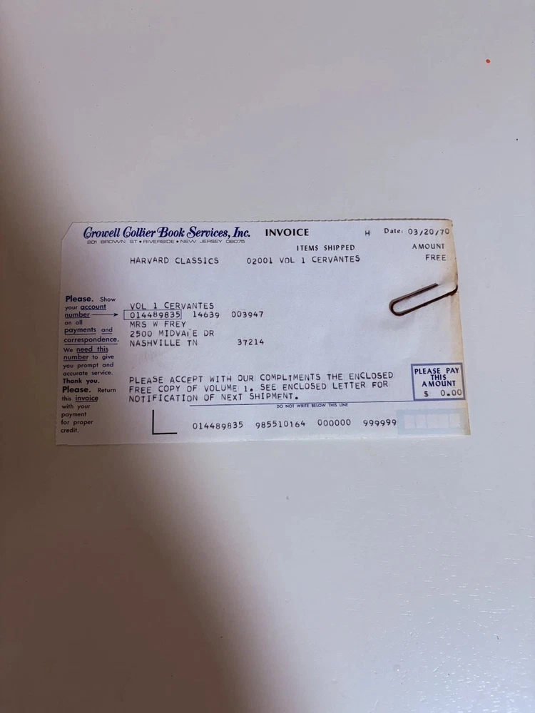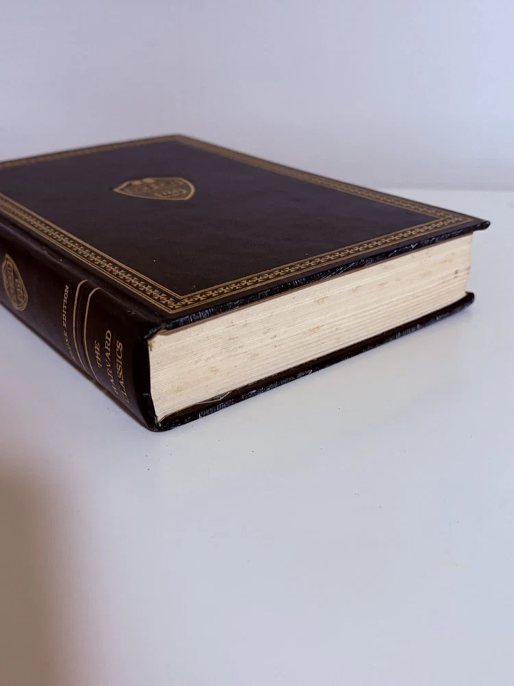 This is a Deluxe Edition of Don Quixote of the Mancha by Miguel de Cervantes, Volume 1 from The Harvard Classics series. Translated by Thomas Shelton and edited by Charles W. Eliot, LL.D. • Publisher: P.F. Collier & Son Corporation, New York • Binding: Deluxe faux leather hardcover in black with gold-embossed spine and cover detailing • Edition: Harvard Classics Deluxe Edition • Volume: Vol. 1 – Cervantes (Don Quixote) • Bonus: Includes original invoice from Crowell-Collier Book Services, dated 1970 • Illustration: Frontispiece image of Don Quixote and Sancho Panza from a painting by Gustave Doré Condition: • Excellent vintage condition • Crisp, clean pages • Binding tight • Light handling wear on cover • Invoice has minor age-related staining