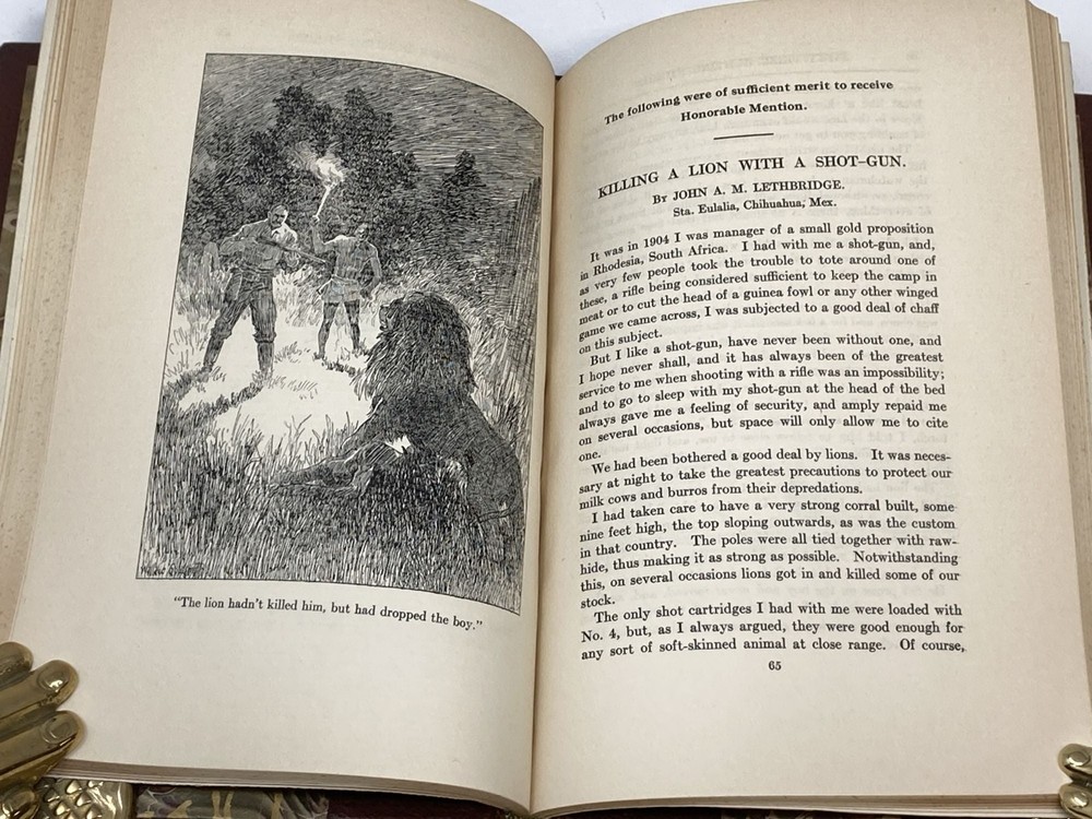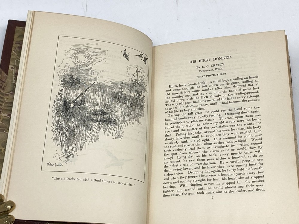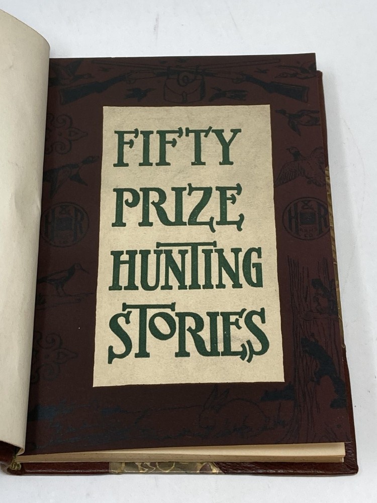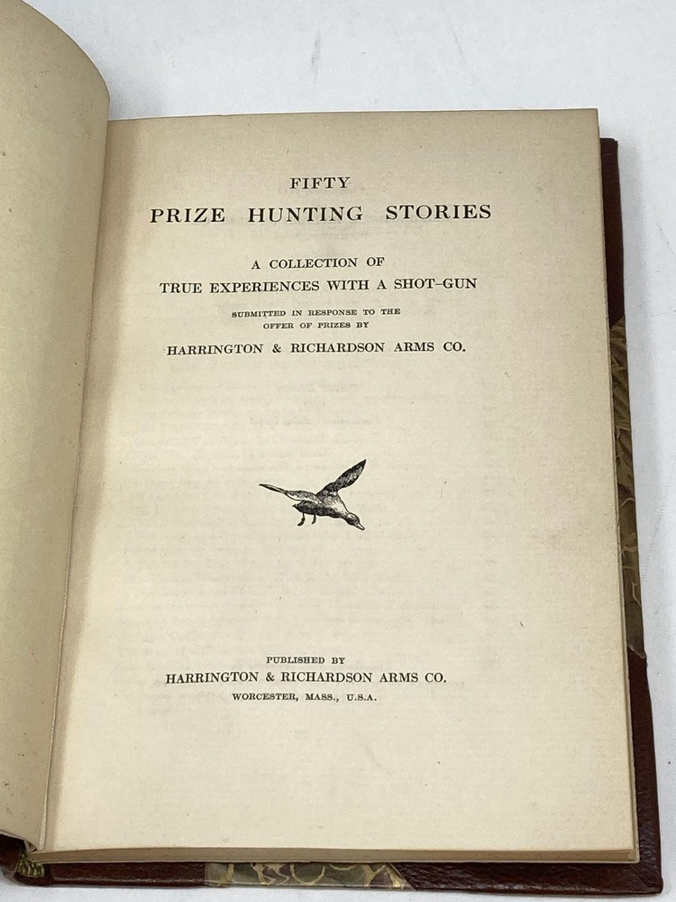 FIFTY PRIZE HUNTING STORIES: A COLLECTION OF TRUE EXPERIENCES WITH A SHOT-GUN SUBMITTED IN RESPONSE TO THE OFFER OF PRIZES BY HARRINGTON & RICHARDSON ARMS CO Author: Cratty, E.C. and others Title: FIFTY PRIZE HUNTING STORIES: A COLLECTION OF TRUE EXPERIENCES WITH A SHOT-GUN SUBMITTED IN RESPONSE TO THE OFFER OF PRIZES BY HARRINGTON & RICHARDSON ARMS CO Publication: Worcester, MA: Harrington & Richardson Arms Co., 1929 Edition: Second Edition Description: Leather-bound. Octavo, 7.7 in. X 5.4 in., pp. 114. Illustrated with numerous sketches. Half calf over marbled boards with gilt rule and gilt bird to front. Gilt title, five raised bands with gilt bandlines and fleurons to spine. Original softcover wraps are bound within, and in Near Fine condition. Light rubbing to extremities. Marbled endpapers. Very Good Plus. Fifty short hunting stories submitted for a gun manufacturer's competition, with the winning entry being "His First Honker" by E.C. Cratty. First published in 1911. Seller ID: 87729 Subject: Sports, Recreation Aardvark Rare Books Eugene, OR We work hard to make your Bookbuying Experience safe, easy and fun. Aardvark Books is a proud member of the ABAA (Antiquarian Booksellers Association of America) and IOBA, Independent Online Booksellers Association. Ezra is also an accredited and Qualified Appraiser of Books and Manuscripts, with a designation from the ASA (American Society of Appraisers), with considerable Archive experience as well. Shipping All books shipped to US destinations are sent via the US Postal Service. Faster shipping is available, please ask before paying. We will combine shipping on items purchased at the same time in order to help reduce costs. International shipping is also available. Please inquire for a shipping quote before ordering. This listing was created by Bibliopolis.