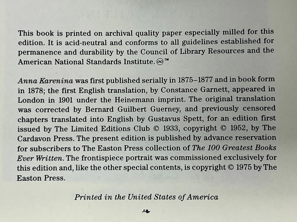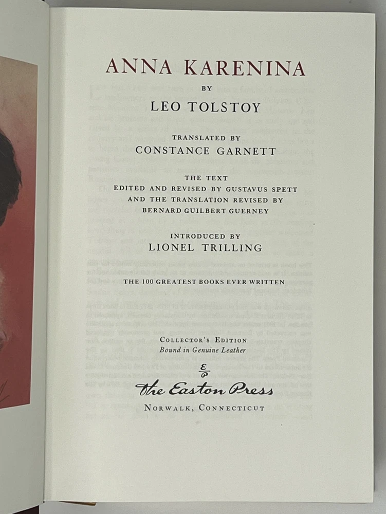 EASTON PRESS: Anna Karenina: Collector's Edition by Leo Tolstoy - 1975 Genuine Leather-Bound Hardcover Published by The Easton Press Please see pictures to determine the exact condition of this book. Please send a message if you have any questions. We ship promptly.
