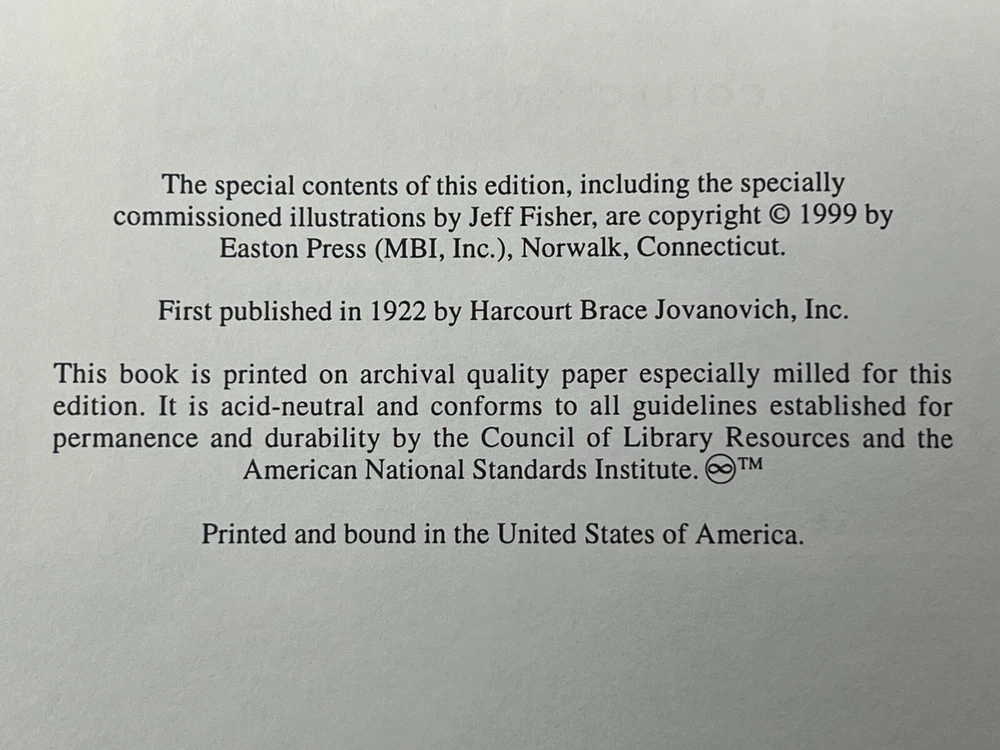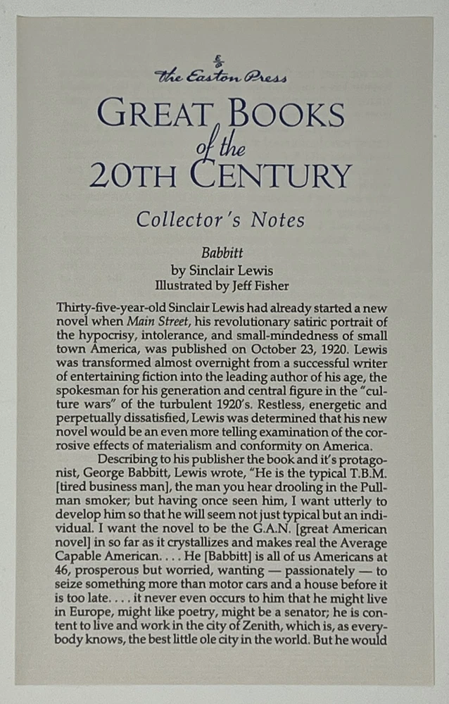 EASTON PRESS: Babbitt: Collector's Edition by Sinclair Lewis - 1999 Genuine Leather-Bound Hardcover Published by The Easton Press Please see pictures to determine the exact condition of this book. Please send a message if you have any questions. We ship promptly.