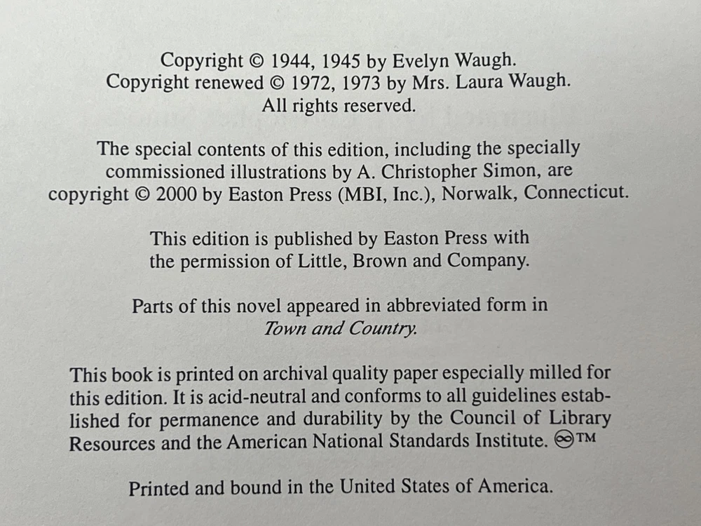 EASTON PRESS: Brideshead Revisited: Collector's Edition by Evelyn Waugh - 2000 Genuine Leather-Bound Hardcover Published by The Easton Press Please see pictures to determine the exact condition of this book. Please send a message if you have any questions. We ship promptly.