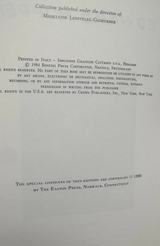 Edward Hopper by Gail Levin A glimpse into the life and works of the famous American Realist painter and printmaker. Dozens of full-color plates of art. Published in a beautiful fine binding: Accented in 22kt gold, printed on archival acid-free paper with gilded edges, custom patterned endpapers, satin ribbon place holder, Smyth sewing & concealed muslin joints. Bound In full leather with hubbed spines. Oversized, quarto: 12.25” x 9”. Illustrated throughout. Published in 1986. First edition thus. An Easton Press 1st edition/1st printing. Condition: NEAR MINT (NEAR FINE). Back cover has several small areas with white paint around the margins (see pics) else FINE. INTERIOR AS NEW. No former owner bookplates, no foxing, no writing. ***A beautiful copy of this special deluxe edition in NEAR FINE condition!*** Please view pictures to appreciate the craftsmanship and condition. Edward Hopper (July 22, 1882 – May 15, 1967) was an American realist painter and printmaker. He is one of America's most renowned artists and known for his skill in capturing American life and landscapes through his art. Hopper's work, spanning oil paintings, watercolors, and etchings, predominantly explores themes of loneliness and isolation within American urban and rural settings. His most famous painting, Nighthawks (1942), epitomizes his interest in the quiet, introspective moments of everyday life. Despite a slow start, Hopper achieved significant recognition by the 1920s, with his work becoming a staple in major American museums. Hopper's technique, marked by a composition of form and use of light to evoke mood, has been influential in the art world and popular culture. His paintings, often set in the architectural landscapes of New York or the serene environments of New England, convey a sense of narrative depth and emotional resonance, making him a pivotal figure in American Realism. Hopper created subdued drama out of commonplace subjects layered with a poetic meaning, inviting narrative interpretations. He was praised for "complete verity" in the America he portrayed. As a fellow book collector, I know how frustrating it can be when items aren’t accurately described or poorly packaged for shipping. That is why I (1) take a lot of pictures and try to describe condition issues as accurately as possible and (2) pack your book purchases with the utmost care before shipping. I have been selling and buying on eBay for over 10 years and have a 100% satisfaction rating, and offer a 100% satisfaction guarantee 30-day return policy. Happy to combine shipping on multiple orders to save you money. Please follow me as I have dozens of Easton Press books and thousands of other collectible books to list in the coming weeks and months!
