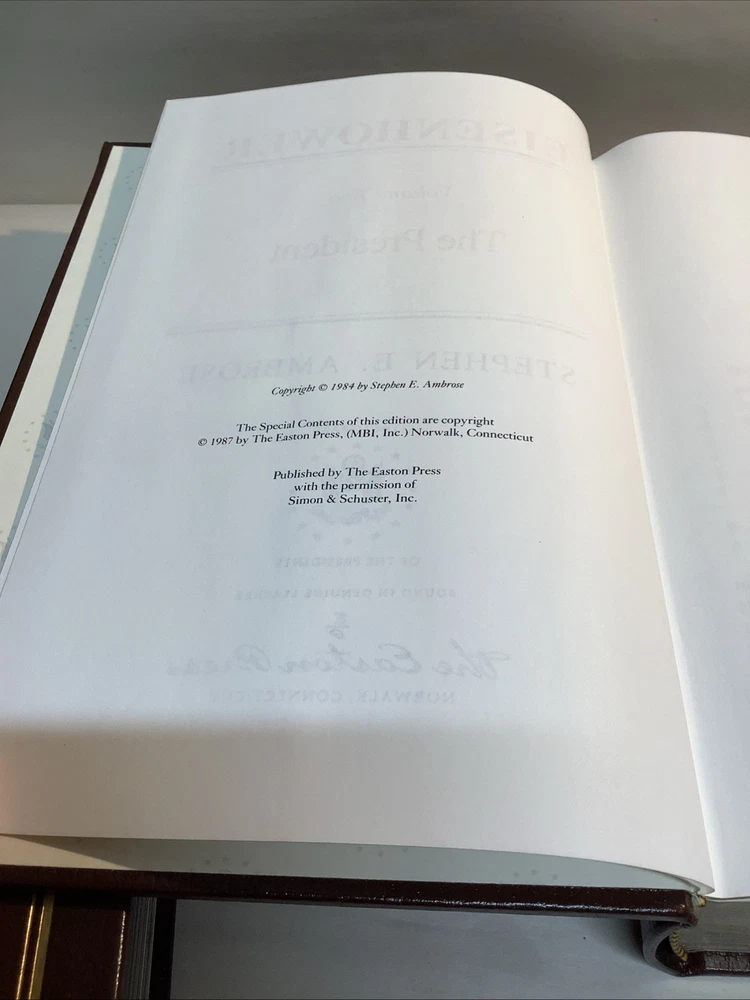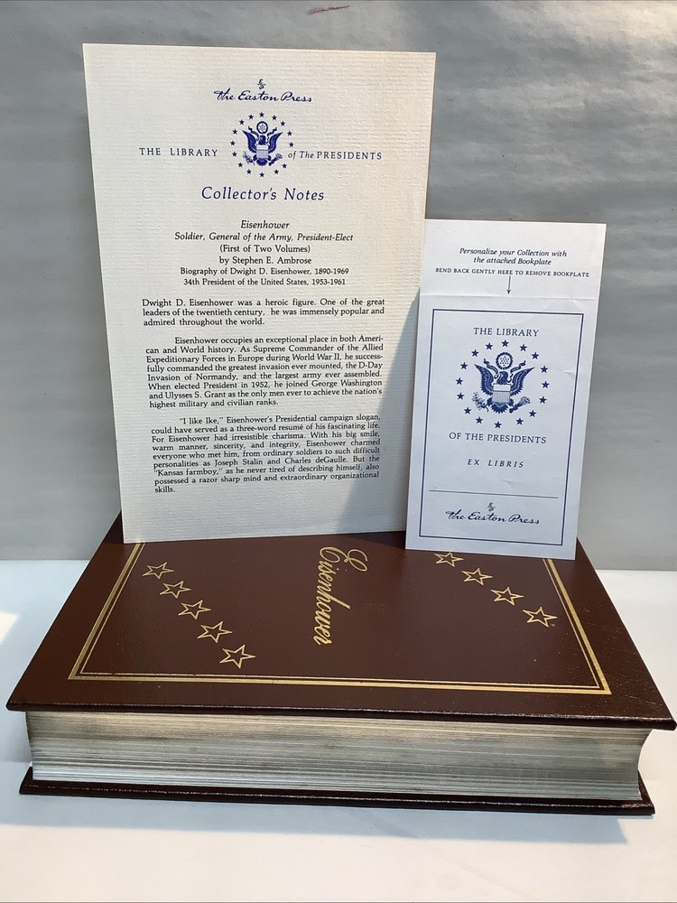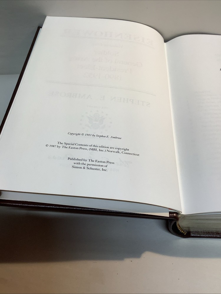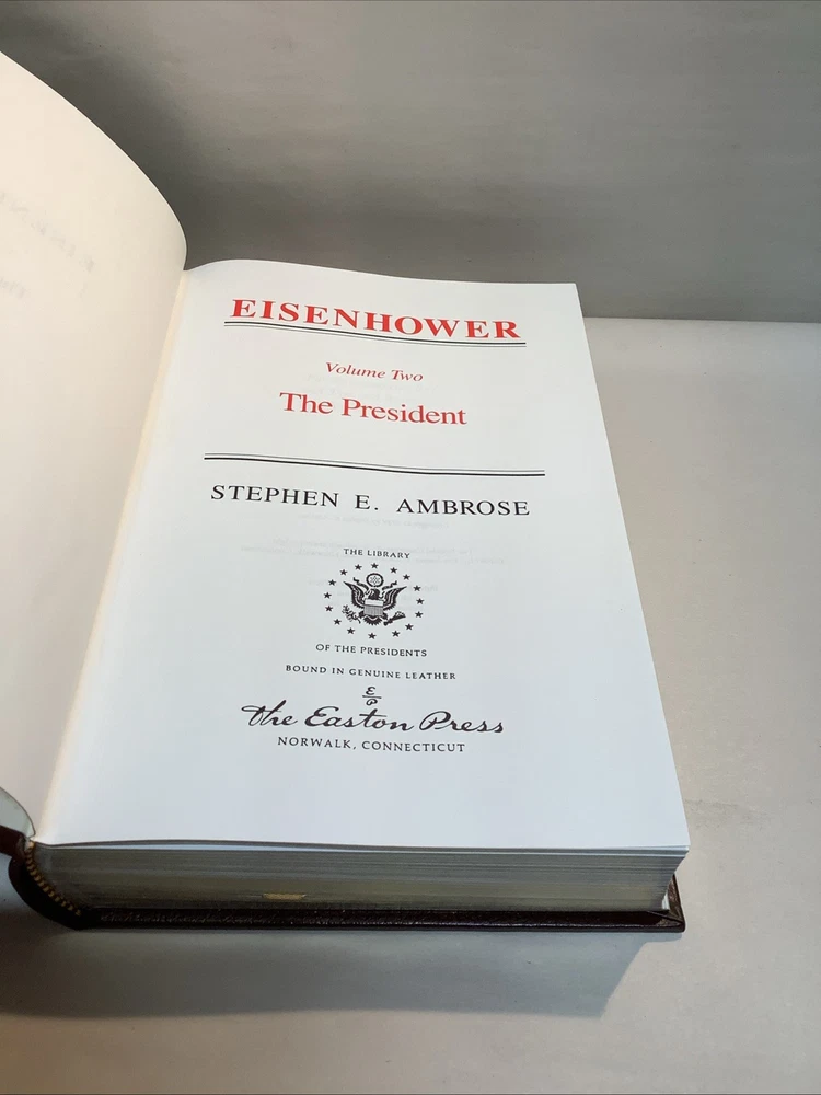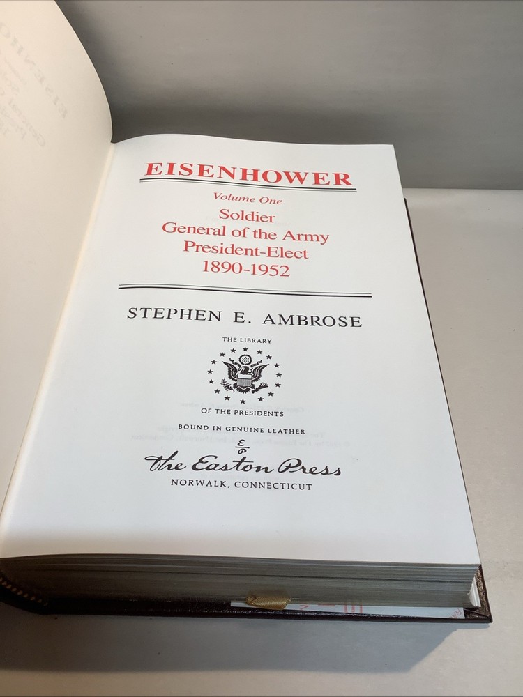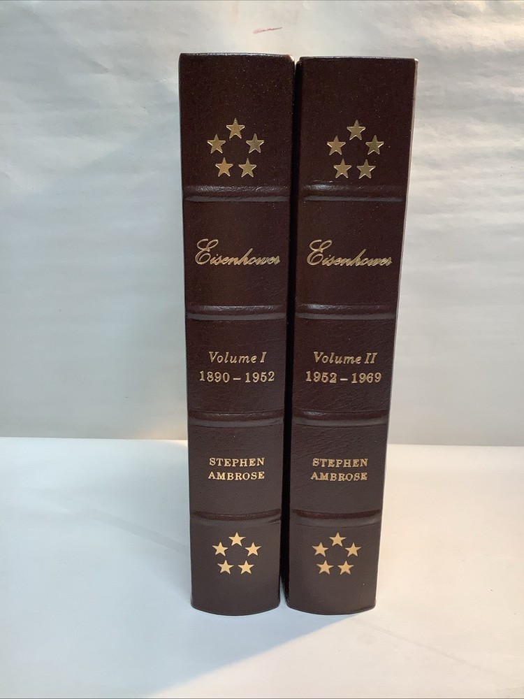 The Easton Press Eisenhower Volume I & II by Stephen Ambrose is a rare and collectible set of leather-bound books published in 1987. This biography and autobiography set provides a comprehensive look at the life of President Dwight D. Eisenhower, focusing on his military career and presidency. The books are beautifully crafted and make for a valuable addition to any collector's library, especially for those interested in American history and political biographies. Please make sure to review all the pictures and ask any questions you may have, as I would like to avoid dealing with refunds or returns.