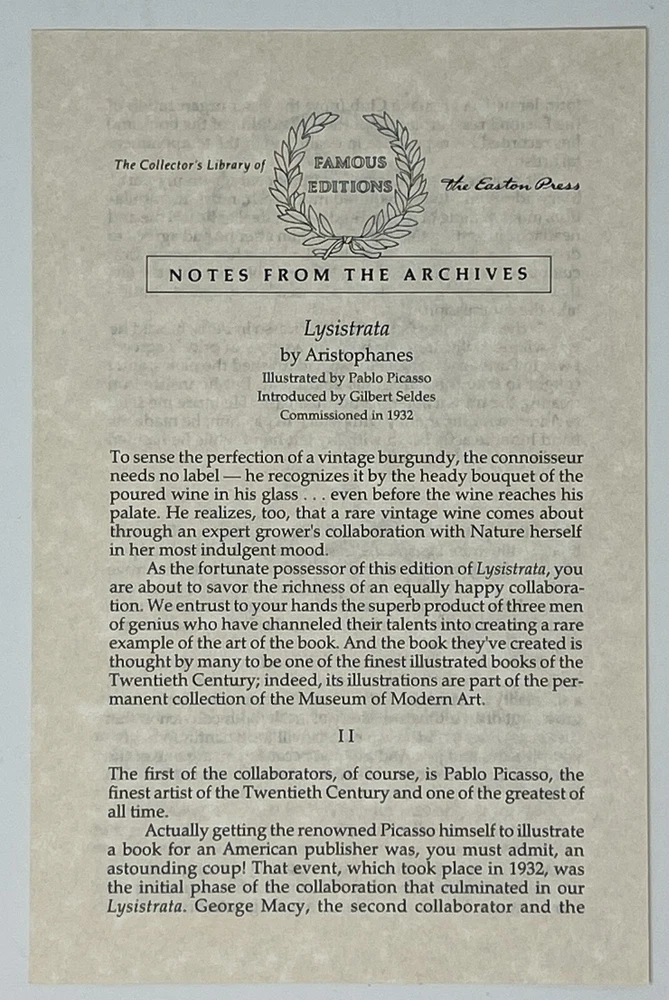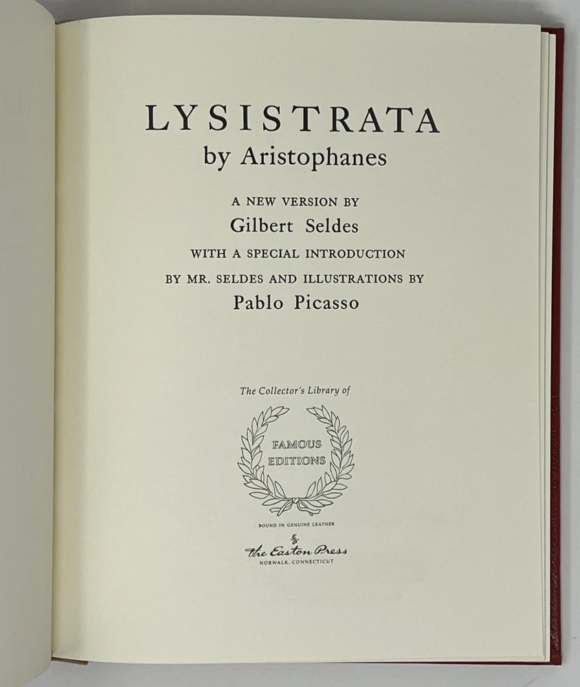 EASTON PRESS: Lysistrata by Aristophanes Illustrated by Pablo Picasso - 1983 Genuine Leather-Bound Hardcover Published by The Easton Press Please see pictures to determine the exact condition of this book. Please send a message if you have any questions. We ship promptly.
