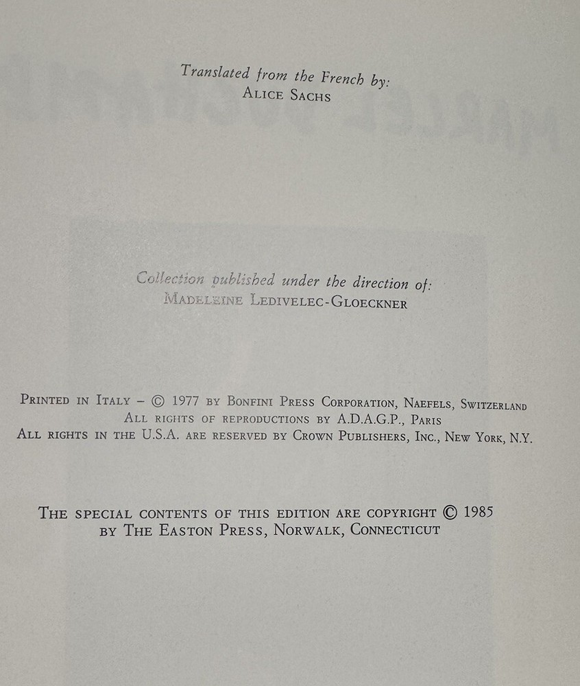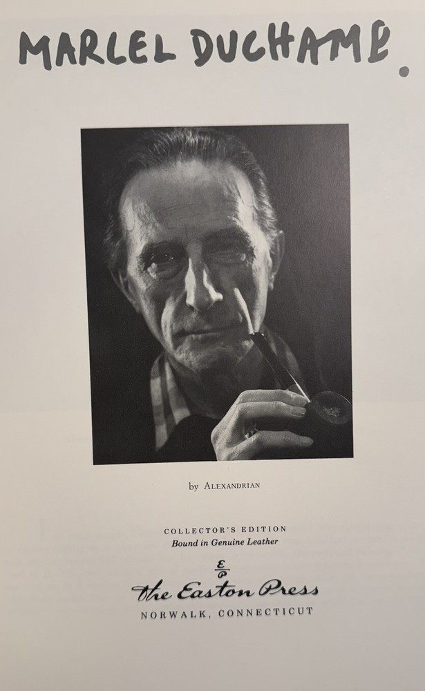 Marcel Duchamp by Alexandrian Biography and art of the famous French painter, sculptor, chess player and writer. Full-color plates of the art. Published in a beautiful fine binding: Accented in 22kt gold, printed on archival acid-free paper with gilded edges, custom patterned endpapers, satin ribbon place holder, Smyth sewing & concealed muslin joints. Bound In full leather with hubbed spines. Oversized, quarto: 12.25” x 9”. Illustrated throughout. Published in 1985. First edition thus. An Easton Press 1st edition/1st printing. Condition: NEAR MINT (FINE). Minimal rubbing and edge wear. INTERIOR AS NEW. No former owner bookplates, no foxing, no writing. ***A spectacular copy of this special deluxe Collector’s Edition in FINE condition!*** Please view pictures to appreciate the craftsmanship and condition. Henri-Robert-Marcel Duchamp (July 1887 – October 1968) was a French painter, sculptor, chess player, and writer whose work is associated with Cubism, Dada, and conceptual art. He is commonly regarded, along with Pablo Picasso and Henri Matisse, as one of the three artists who helped to define the revolutionary developments in the plastic arts in the opening decades of the 20th century, responsible for significant developments in painting and sculpture. He has had an immense impact on 20th- and 21st-century art, and a seminal influence on the development of conceptual art. By the time of World War I, he had rejected the work of many of his fellow artists (such as Henri Matisse) as "retinal", intended only to please the eye. Instead, he wanted to use art to serve the mind. As a fellow book collector, I know how frustrating it can be when items aren’t accurately described or poorly packaged for shipping. That is why I (1) take a lot of pictures and try to describe condition issues as accurately as possible and (2) pack your book purchases with the utmost care before shipping. I have been selling and buying on eBay for over 10 years and have a 100% satisfaction rating, and offer a 100% satisfaction guarantee 30-day return policy. Happy to combine shipping on multiple orders to save you money. Please follow me as I have dozens of signed and collectible Easton Press books and thousands of other rare and collectible books to list in the coming weeks and months!