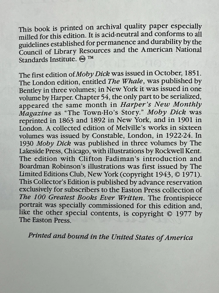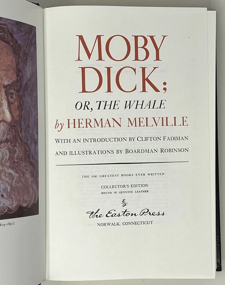 EASTON PRESS: Moby Dick; or, The Whale by Herman Melville: Collector's Edition - 1977 Genuine Leather-Bound Hardcover Published by The Easton Press Please see pictures to determine the exact condition of this book. Please send a message if you have any questions. We ship promptly.