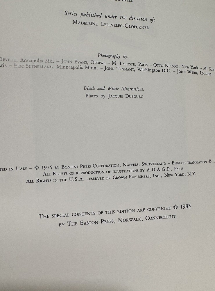 Nicolas de Stael by Guy Dumur Biography and art of the famous French Abstract impasto painter. Full-color plates of the art. Published in a beautiful fine binding: Accented in 22kt gold, printed on archival acid-free paper with gilded edges, custom patterned endpapers, satin ribbon place holder, Smyth sewing & concealed muslin joints. Bound In full leather with hubbed spines. Oversized, quarto: 12.25” x 9”. Illustrated throughout. Published in 1983. First edition thus. An Easton Press 1st edition/1st printing. Condition: NEAR MINT (FINE). Minimal rubbing and edge wear. INTERIOR AS NEW. No former owner bookplates, no foxing, no writing. ***A spectacular copy of this special deluxe Collector’s Edition in FINE condition!*** Please view pictures to appreciate the craftsmanship and condition. Nicolas de Staël (January 5, 1914 – March 16, 1955) was a French painter of Russian origin known for his use of a thick impasto and his highly abstract landscape painting. He also worked with collage, illustration and textiles. He had considerable success in the United States, and England in the early 1950s. In 1950 Leo Castelli organized a group exhibition at the Sidney Janis Gallery in New York City that included him.In 1952, he had one-man exhibitions in London, Montevideo, and in Paris. In March 1953, he had his first official one-man exhibition at M. Knoedler & Co. in New York City. The show was both a commercial and critical success. In 1953 he had an exhibition at the Phillips Gallery in Washington DC, (known today as The Phillips Collection in Washington DC) and they acquired two more of his canvasses. Visiting the United States in 1953 de Staël and Francoise visited MoMA, the Barnes Foundation in Merion, Pennsylvania and various other important institutions. By the end of 1953 the demand for de Staël's paintings was so great that Paul Rosenberg raised his prices and continually requested more paintings. The demand was so high for his planned spring 1954 exhibition, that Rosenberg requested an additional fifteen paintings. Once again this exhibition was both commercially and critically successful. As a fellow book collector, I know how frustrating it can be when items aren’t accurately described or poorly packaged for shipping. That is why I (1) take a lot of pictures and try to describe condition issues as accurately as possible and (2) pack your book purchases with the utmost care before shipping. I have been selling and buying on eBay for over 10 years and have a 100% satisfaction rating, and offer a 100% satisfaction guarantee 30-day return policy. Happy to combine shipping on multiple orders to save you money. Please follow me as I have dozens of signed and collectible Easton Press books and thousands of other rare and collectible books to list in the coming weeks and months!