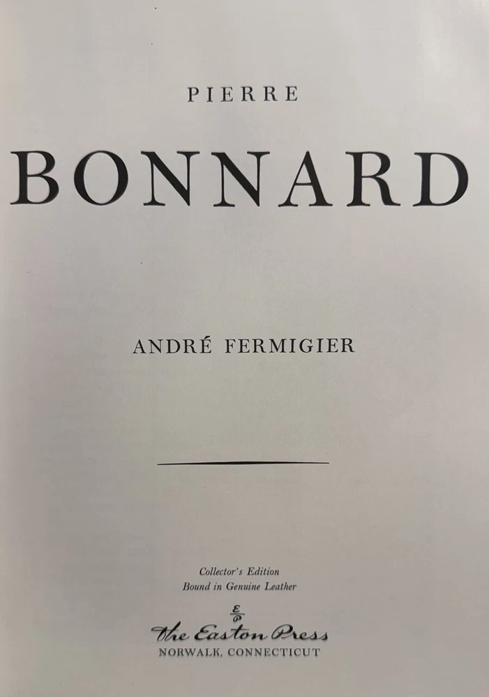 Pierre Bonnard by Andre Fermigier A glimpse into the life and works of the famous French painter, illustrator and printmaker. Dozens of full-color plates of art. Published in a beautiful fine binding: Accented in 22kt gold, printed on archival acid-free paper with gilded edges, custom patterned endpapers, satin ribbon place holder, Smyth sewing & concealed muslin joints. Bound In full leather with hubbed spines. Oversized, quarto: 12.25” x 9”. Illustrated throughout. Published in 1984. First edition thus. An Easton Press 1st edition/1st printing. Condition: NEAR MINT (NEAR FINE). Top cover has a light mark across foot and back cover has a very light scratch else FINE. INTERIOR AS NEW. No former owner bookplates, no foxing, no writing. ***A beautiful copy of this special deluxe edition in NEAR FINE condition!*** Please view pictures to appreciate the craftsmanship and condition. Pierre Bonnard (October 1867 – January 1947) was a French painter, illustrator and printmaker, known especially for the stylized decorative qualities of his paintings and his bold use of color. A founding member of the Post-Impressionist group of avant-garde painters Les Nabis, his early work was strongly influenced by the work of Paul Gauguin, as well as the prints of Hokusai and other Japanese artists. Bonnard was a leading figure in the transition from Impressionism to Modernism. He painted landscapes, urban scenes, portraits and intimate domestic scenes, where the backgrounds, colors and painting style usually took precedence over the subject. As a fellow book collector, I know how frustrating it can be when items aren’t accurately described or poorly packaged for shipping. That is why I (1) take a lot of pictures and try to describe condition issues as accurately as possible and (2) pack your book purchases with the utmost care before shipping. I have been selling and buying on eBay for over 10 years and have a 100% satisfaction rating, and offer a 100% satisfaction guarantee 30-day return policy. Happy to combine shipping on multiple orders to save you money. Please follow me as I have dozens of Easton Press books and thousands of other collectible books to list in the coming weeks and months!