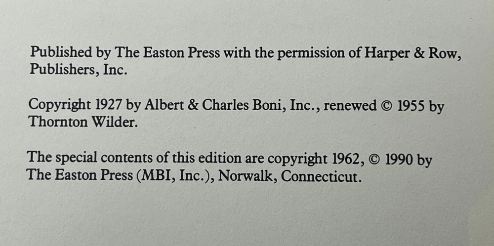 EASTON PRESS: The Bridge of San Luis Rey by Thornton Wilder - 1990 Genuine Leather-Bound Hardcover Published by The Easton Press Please see pictures to determine the exact condition of this book. Please send a message if you have any questions. We ship promptly.