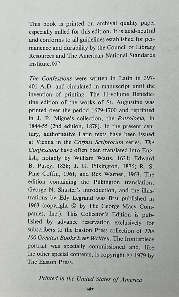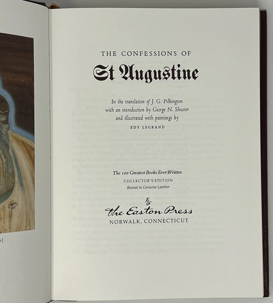 EASTON PRESS: The Confessions of Saint Augustine: Collector's Edition Translated by J. G. Pilkington - 1979 Genuine Leather Bound Hardcover Published by The Easton Press Please see pictures to determine the exact condition of this book. Please send a message if you have any questions. We ship promptly.