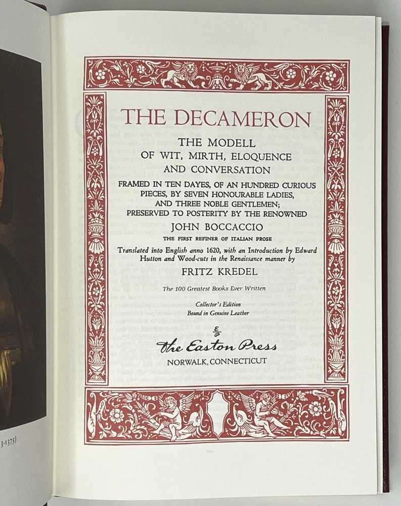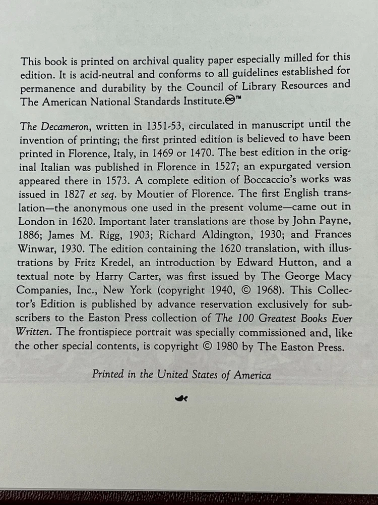 EASTON PRESS: The Decameron: Collector's Edition by John Boccaccio - 1980 Genuine Leather-Bound Hardcover Published by The Easton Press Please see pictures to determine the exact condition of this book. Please send a message if you have any questions. We ship promptly.