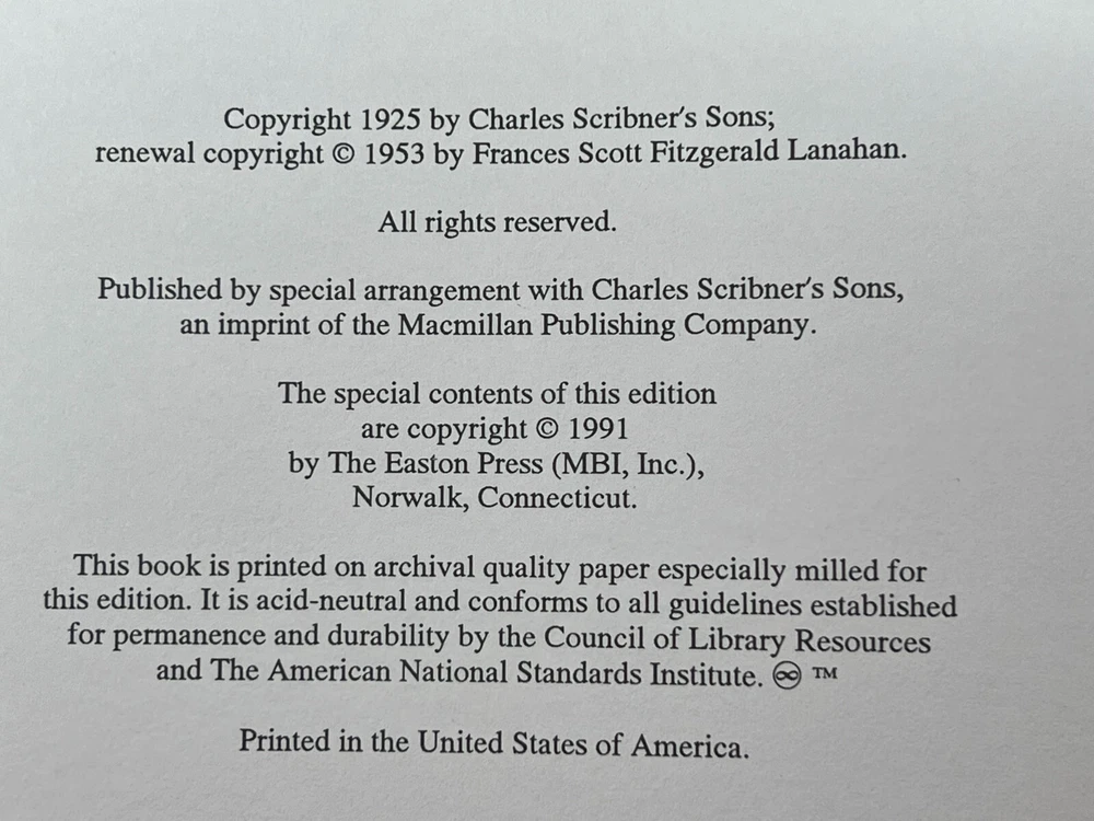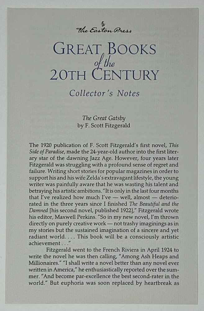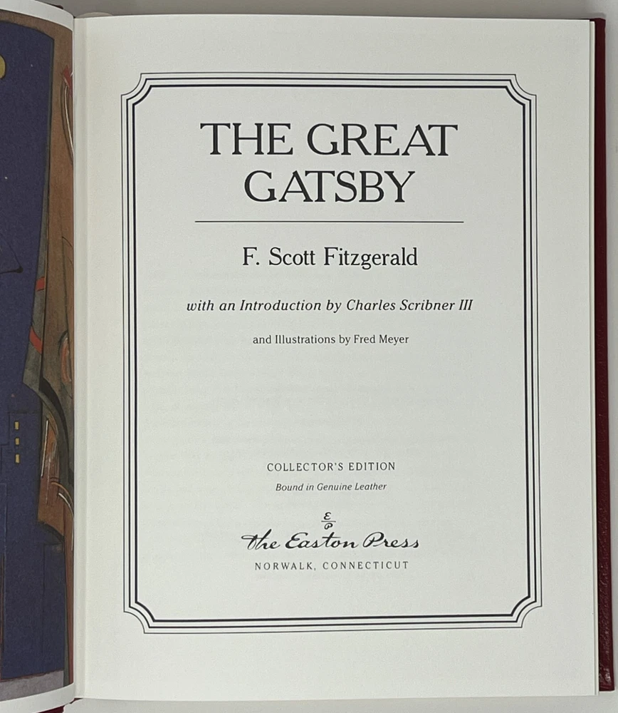 EASTON PRESS: The Great Gatsby: Collector's Edition by F. Scott Fitzgerald - 1991 Genuine Leather-Bound Hardcover Published by The Easton Press Please see pictures to determine the exact condition of this book. Please send a message if you have any questions. We ship promptly.