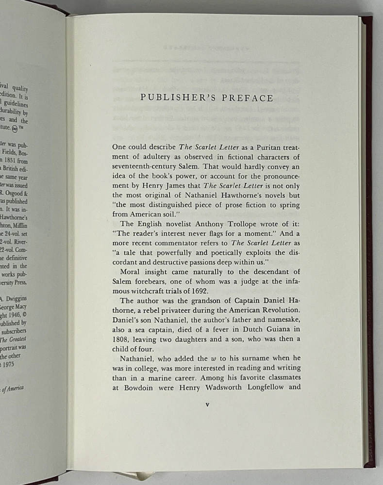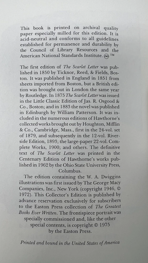 EASTON PRESS: The Scarlet Letter: Collector's Edition by Nathaniel Hawthorne - 1975 Genuine Leather-Bound Hardcover Published by The Easton Press Please see pictures to determine the exact condition of this book. Please send a message if you have any questions. We ship promptly.