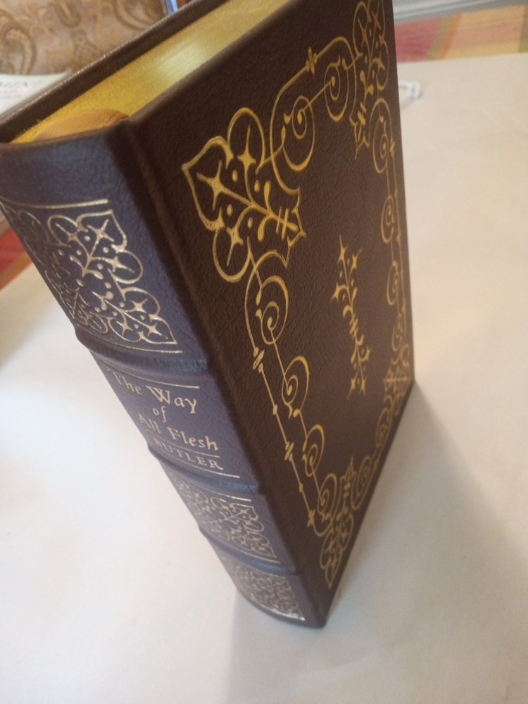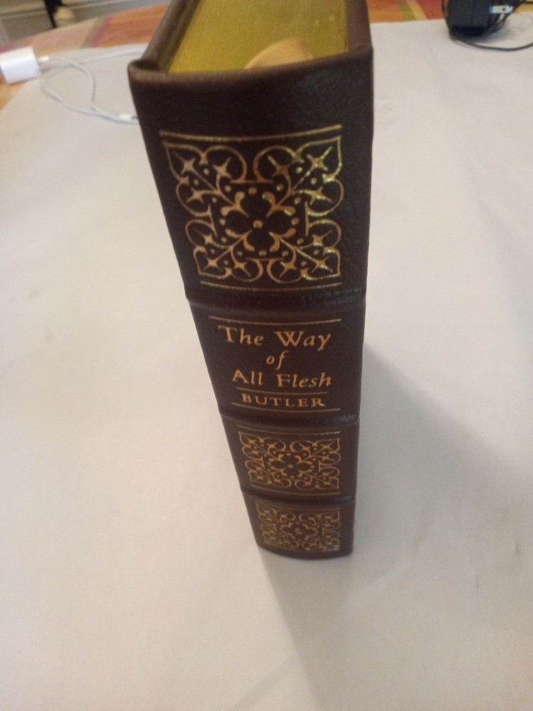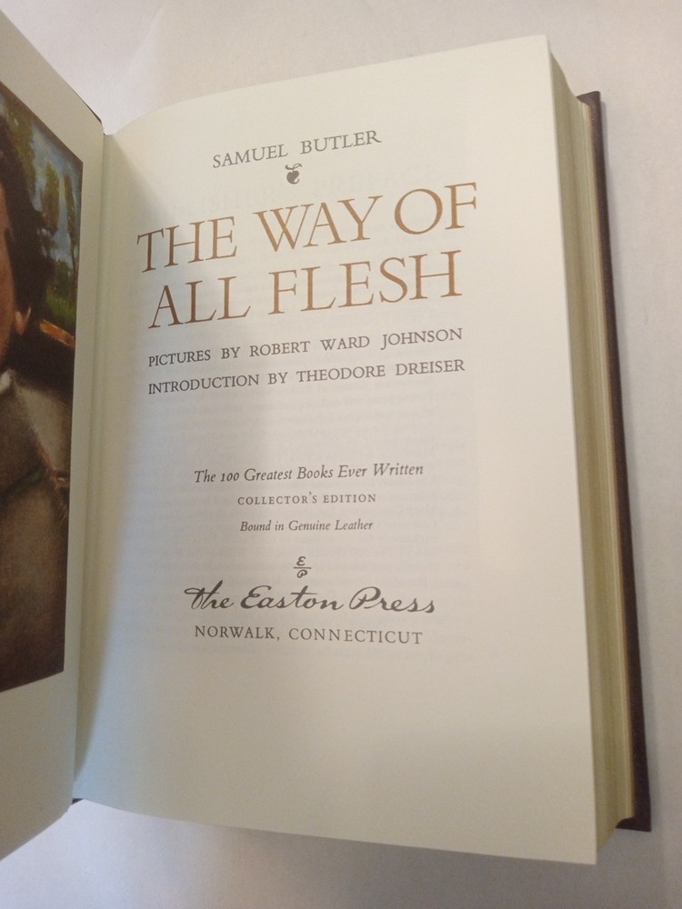 The Way of All Flesh is a collector's edition book written by Samuel Butler and published by Easton Press in 1980. This hardcover book is part of The 100 Greatest Books Ever Written series and is illustrated by Robert Ward Johnson. It has 588 pages and is written in English. The book is bound in genuine leather with a unused book plate, printed on archival quality paper, and has gilded page edges. It also features moire endpapers and an attached ribbon book mark. The book is categorized under Books & Magazines and Books, and its topic includes historical fiction and British literature.