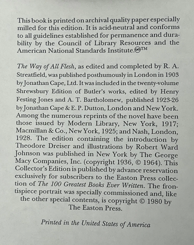 EASTON PRESS: The Way of All Flesh: Collector's Edition by Samuel Butler - 1980 Genuine Leather-Bound Hardcover Published by The Easton Press Please see pictures to determine the exact condition of this book. Please send a message if you have any questions. We ship promptly.