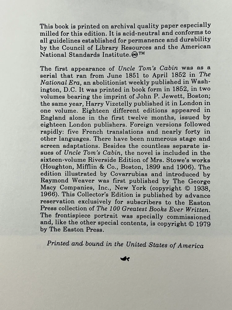EASTON PRESS: Uncle Tom's Cabin; or, Life Among the Lowly: Collector's Edition by Harriet Beecher Stowe - 1979 Genuine Leather Bound Hardcover Published by The Easton Press Please see pictures to determine the exact condition of this book. Please send a message if you have any questions. We ship promptly.