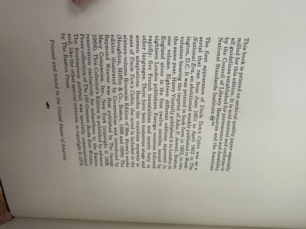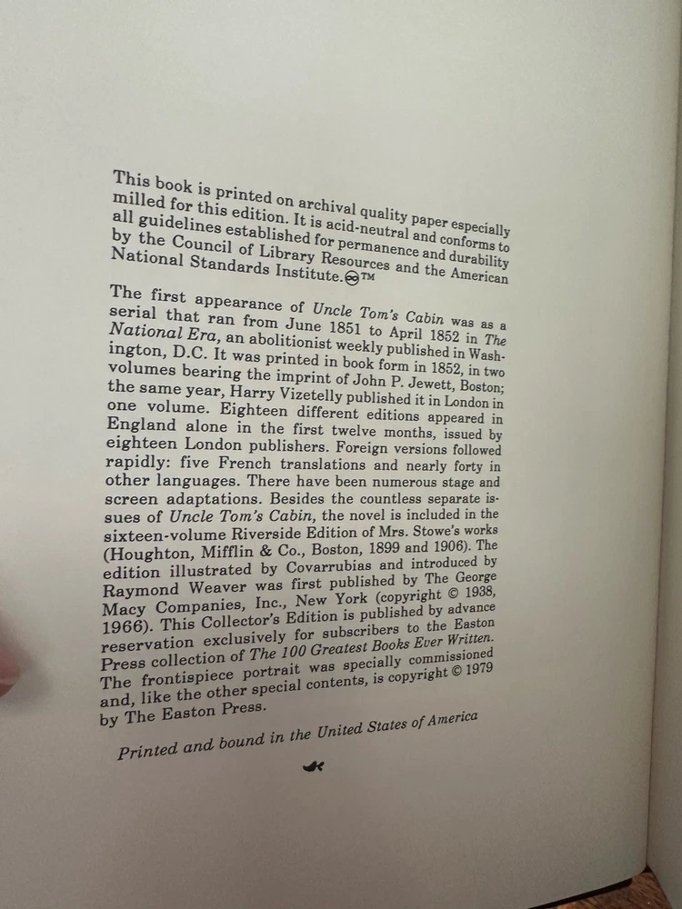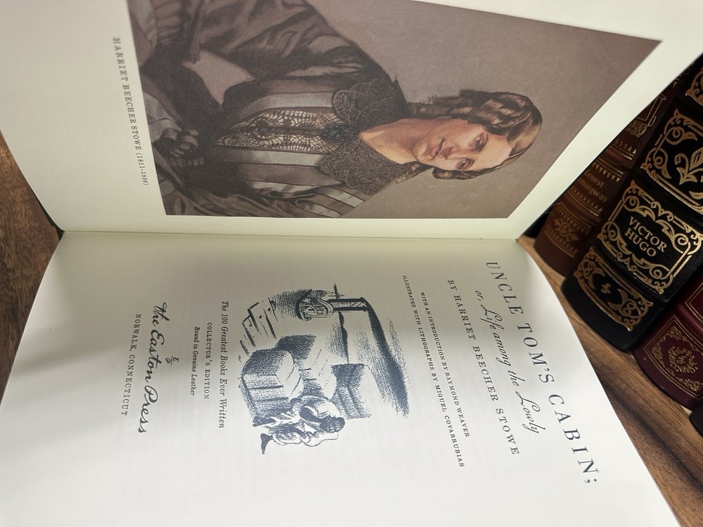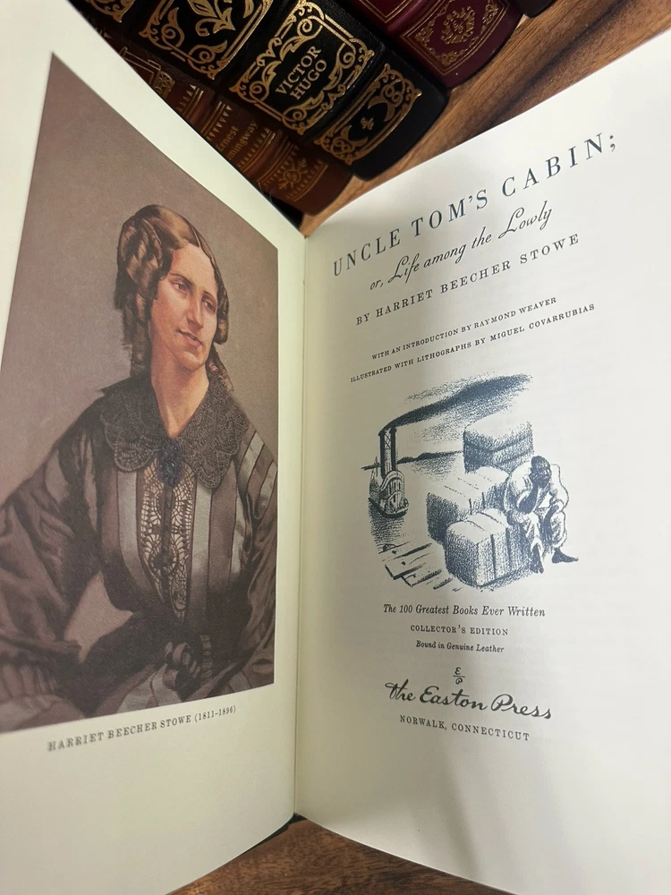 Dive into the poignant world of "Uncle Tom's Cabin; or, Life Among the Lowly" by Harriet Beecher Stowe, presented in the esteemed Collector's Edition from The Easton Press. Published in 1979 as part of The 100 Greatest Books Ever Written series, this hardcover gem is a testament to historical fiction's timeless power, boasting 294 pages of narrative rich with emotion and depth. Admire the craftsmanship of this collectible item, featuring genuine leather binding, moire endpapers, gilded page edges, and an attached ribbon book mark. Miguel Covarrubias's illustrations enhance the reading experience, while the book's preservation on archival quality paper ensures it remains a pristine piece of world literature and classics for years to come.