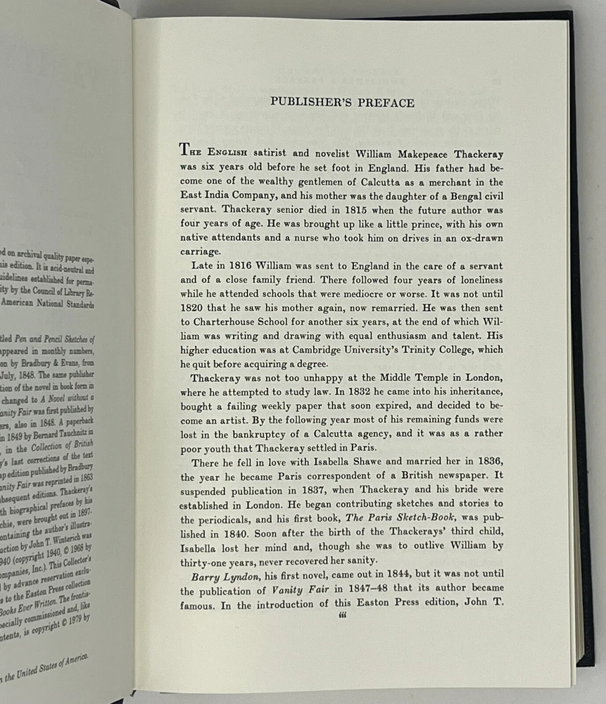 EASTON PRESS: Vanity Fair: Collector's Edition by William Makepeace Thackeray - 1979 Genuine Leather-Bound Hardcover Published by The Easton Press Please see pictures to determine the exact condition of this book. Please send a message if you have any questions. We ship promptly.