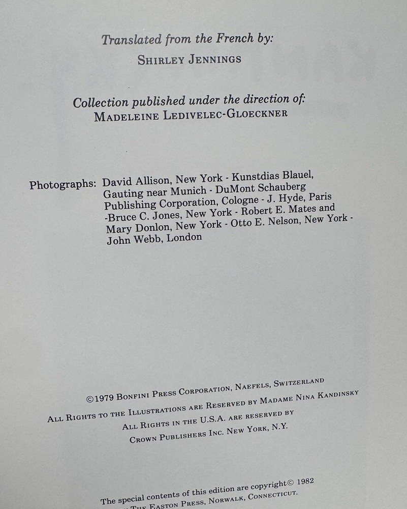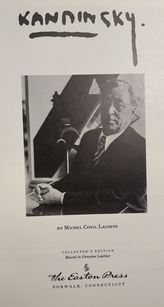 Wassily Kandinsky by Michel Conil Lacoste Biography and art of the famous Russian painter and art theorist. Full-color plates of the art. Published in a beautiful fine binding: Accented in 22kt gold, printed on archival acid-free paper with gilded edges, custom patterned endpapers, satin ribbon place holder, Smyth sewing & concealed muslin joints. Bound In full leather with hubbed spines. Oversized, quarto: 12.25” x 9”. Illustrated throughout. Published in 1982. First edition thus. An Easton Press 1st edition/1st printing. Condition: NEAR MINT (NEAR FINE). Minimal rubbing and edge wear. A several-inch-long scratch on rear board else FINE. INTERIOR AS NEW. No former owner bookplates, no foxing, no writing. ***A beautiful copy of this special deluxe Collector’s Edition in NEAR FINE condition!*** Please view pictures to appreciate the craftsmanship and condition. Wassily Wassilyevich Kandinsky (December 1866 – December 1944) was a Russian painter and art theorist. Kandinsky is generally credited as one of the pioneers of abstraction in western art. Born in Moscow, he spent his childhood in Odessa, where he graduated from Odessa Art School. He enrolled at the University of Moscow, studying law and economics. Successful in his profession, he was offered a professorship (chair of Roman Law) at the University of Dorpat (today Tartu, Estonia). Kandinsky began painting studies (life-drawing, sketching and anatomy) at the age of 30. He moved to France in 1933, where he lived for the rest of his life, becoming a French citizen in 1939 and producing some of his most prominent art. As a fellow book collector, I know how frustrating it can be when items aren’t accurately described or poorly packaged for shipping. That is why I (1) take a lot of pictures and try to describe condition issues as accurately as possible and (2) pack your book purchases with the utmost care before shipping. I have been selling and buying on eBay for over 10 years and have a 100% satisfaction rating, and offer a 100% satisfaction guarantee 30-day return policy. Happy to combine shipping on multiple orders to save you money. Please follow me as I have dozens of signed and collectible Easton Press books and thousands of other rare and collectible books to list in the coming weeks and months!