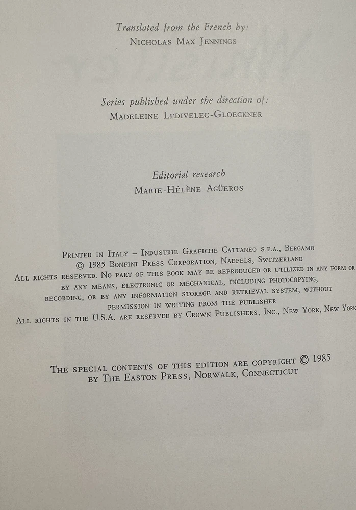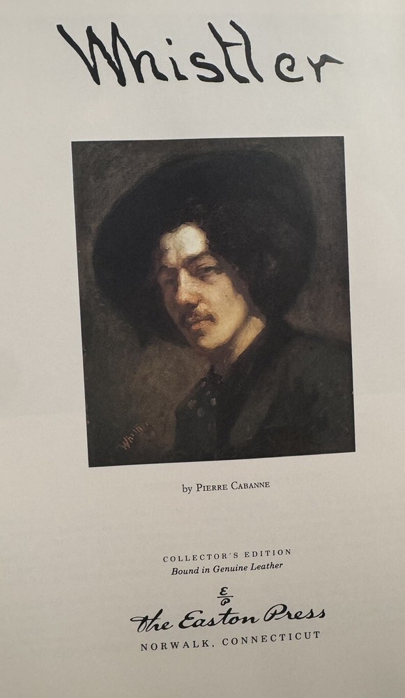Whistler by Pierre Cabanne Biography and works of the famous American painter. Full-color plates of art. Published in a beautiful fine binding: Accented in 22kt gold, printed on archival acid-free paper with gilded edges, custom patterned endpapers, satin ribbon place holder, Smyth sewing & concealed muslin joints. Bound In full leather with hubbed spines. Oversized, quarto: 12.25” x 9”. Illustrated throughout. Published in 1985. First edition thus. An Easton Press 1st edition/1st printing. Condition: VERY GOOD. Big bump to a corner which has also pushed the text block in a bit. Some water dampening warping to top of front board which has caused some minor waviness from the water dampening to the corner of adjacent text block. No former owner bookplates, no foxing, no writing. ***A scarce copy of this special deluxe Collector’s Edition in VERY GOOD condition!*** Please view pictures to appreciate the craftsmanship and condition. James Abbott McNeill Whistler RBA (July 10, 1834 – July 17, 1903) was an American painter in oils and watercolor, and printmaker. He was active during the American Gilded Age and based primarily in the United Kingdom. He eschewed sentimentality and moral allusion in painting and was a leading proponent of the credo "art for art's sake". His most famous painting, Arrangement in Grey and Black No. 1 (1871), commonly known as Whistler's Mother, is a revered and often parodied portrait of motherhood. Whistler influenced the art world and the broader culture of his time with his aesthetic theories and his friendships with other leading artists and writers. As a fellow book collector, I know how frustrating it can be when items aren’t accurately described or poorly packaged for shipping. That is why I (1) take a lot of pictures and try to describe condition issues as accurately as possible and (2) pack your book purchases with the utmost care before shipping. I have been selling and buying on eBay for over 10 years and have a 100% satisfaction rating, and offer a 100% satisfaction guarantee 30-day return policy. Happy to combine shipping on multiple orders to save you money. Please follow me as I have dozens of signed and collectible Easton Press books and thousands of other rare and collectible books to list in the coming weeks and months!