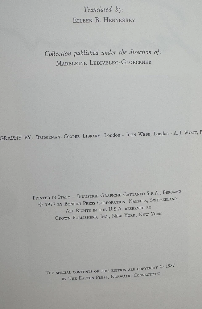 Joseph Mallord William Turner by Jean Selz A glimpse into the famous English Romantic painter’s life and works. Full-color plates of art. Published in a beautiful fine binding: Accented in 22kt gold, printed on archival acid-free paper with gilded edges, custom patterned endpapers, satin ribbon place holder, Smyth sewing & concealed muslin joints. Bound In full leather with hubbed spines. Oversized, quarto: 12.25” x 9”. Illustrated throughout. Published in 1987. First edition thus. An Easton Press 1st edition/1st printing. Condition: NEAR MINT (NEAR FINE). A few areas of rubbing on the top and back boards else FINE. Interior is like new. No former owner bookplates, no foxing, no writing. ***A beautiful copy of this special deluxe edition in NEAR FINE condition**** Please view pictures to appreciate the craftsmanship and condition. Joseph Mallord William Turner RA (April 1775 – December 1851), known in his time as William Turner, was an English Romantic painter, printmaker and watercolorist. He is known for his expressive coloring, imaginative landscapes and turbulent, often violent marine paintings. He left behind more than 550 oil paintings, 2,000 watercolors, and 30,000 works on paper. He was championed by the leading English art critic John Ruskin from 1840, and is today regarded as having elevated landscape painting to an eminence rivalling history painting. As a fellow book collector, I know how frustrating it can be when items aren’t accurately described or poorly packaged for shipping. That is why I (1) take a lot of pictures and try to describe condition issues as accurately as possible and (2) pack your book purchases with the utmost care before shipping. I have been selling and buying on eBay for over 10 years and have a 100% satisfaction rating, and offer a 100% satisfaction guarantee 30-day return policy. Happy to combine shipping on multiple orders to save you money. Please follow me as I have dozens of Easton Press books and thousands of other collectible books to list in the coming weeks and months!