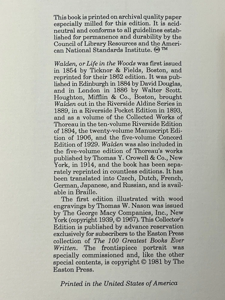EASTON PRESS: Walden or Life in the Woods: Collector's Edition by Henry David Thoreau - 1981 Genuine Leather-Bound Hardcover Published by The Easton Press Please see pictures to determine the exact condition of this book. Please send a message if you have any questions. We ship promptly.