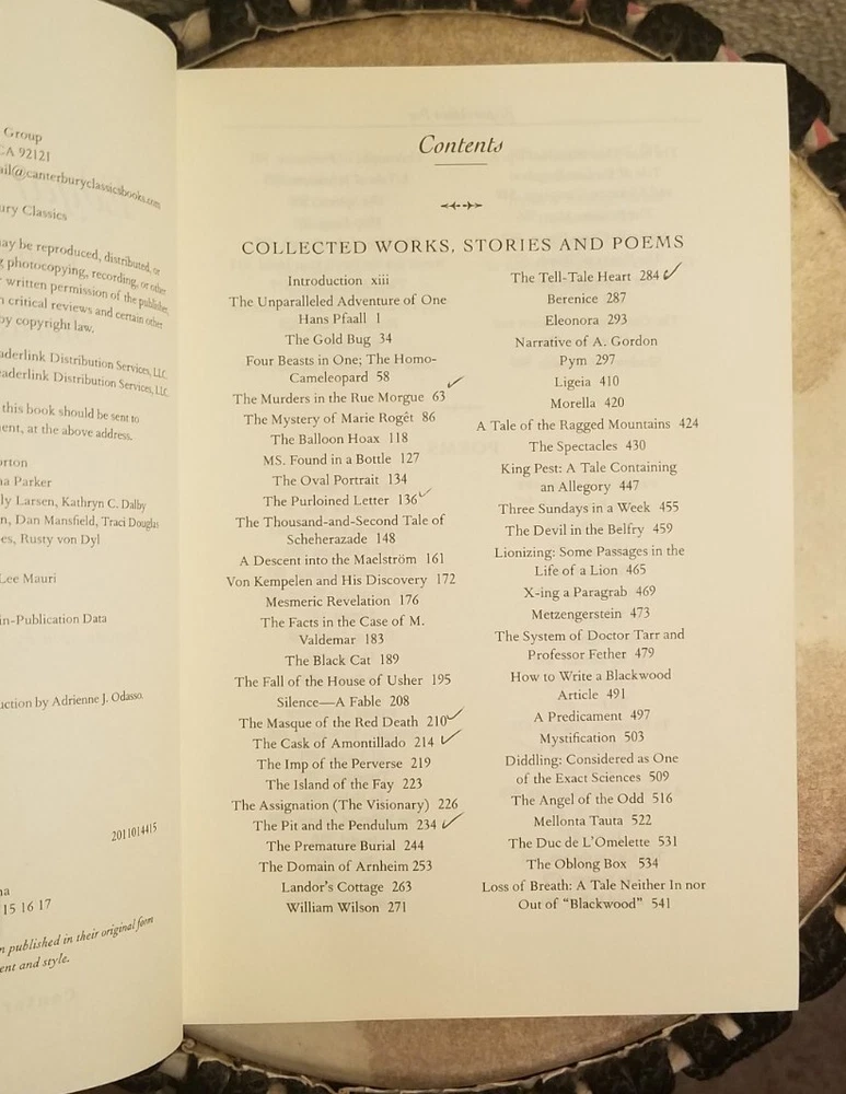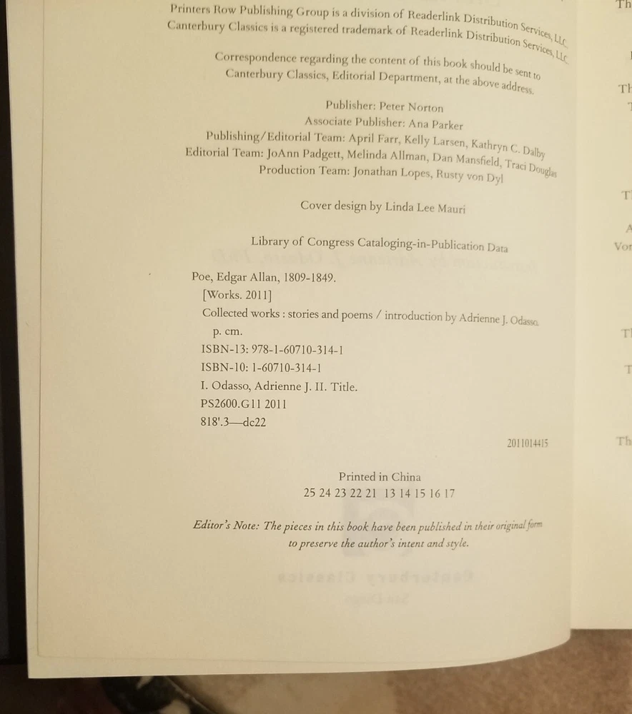 EDGAR ALLAN POE (COLLECTED WORKS) CANTERBURY CLASSICS Leather Bound 2011. Very good condition. All pages are intact. The binding is in good condition. Previous owner checked off stories that they read in the table of contents. No other markings. See photos. Ships USPS media mail, well packaged.