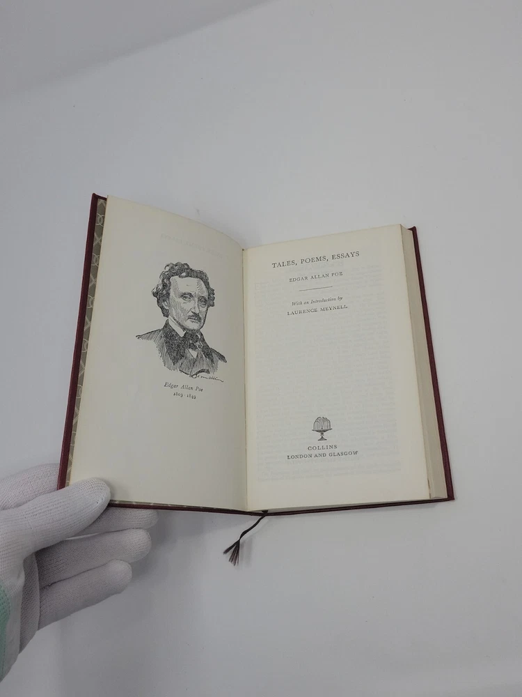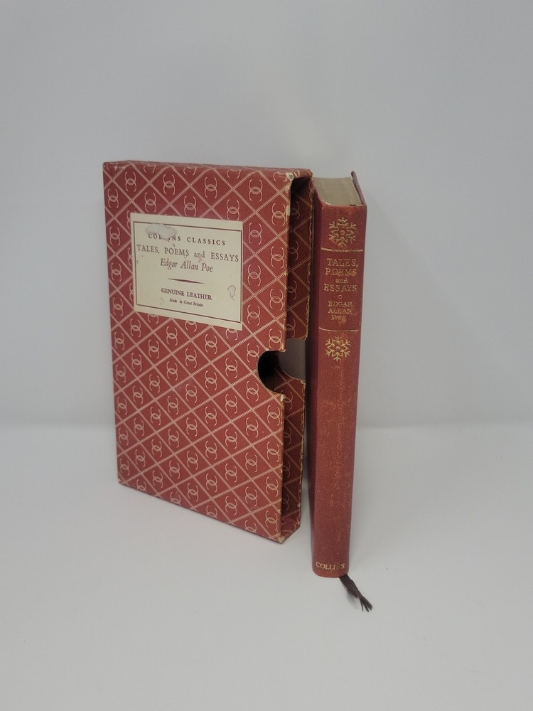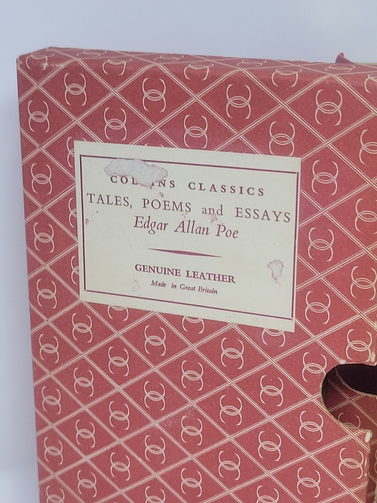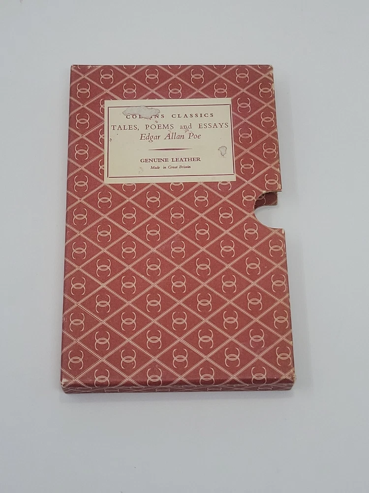 Delve into the world of macabre and classic literature with this vintage leather-bound edition of Edgar Allan Poe's "Tales, Poems and Essays". The second edition of this timeless collection, published in 1963 by Collins London and Glasgow, contains 576 pages of Poe's fiction and poetry for young adults, ages 9-12, and adults. This slipcased book measures 7 1/4 inches in length, 4.5 inches in width, and 1 inch in height. It features a dark and mysterious cover that perfectly captures the essence of Poe's haunting tales. This collectible book weighs 11.2 oz and is the perfect addition to any literature lover's collection. Please view the photos provided for a more detailed description and to determine the condition for yourself. I have documented any signs of wear in the photos. The binding is solid and intact. There's plenty of spring in the pages. No writing inside and no tears or dog ears. There is some cosmetic wear along the spine as well as on the slip case. Overall it's in Excellent Used Condition. What you see in the photos is exactly what you'll receive. WE PACKAGE AND SHIP WITH GREAT CARE! My wife and I do our best to describe each item in detail and provide pictures that feature any defects or issues that we are aware of. We are not experts, just collectors and estate purchaser's, we welcome questions and comments. If you need more photos, just ask, we're happy to send more. Questions are always welcome…we will make every effort to respond quickly. Generally, you'll receive a reply within minutes OFFERS ARE ALWAYS WELCOME! We ship within 1 day after receiving payment, Monday thru Friday. All items are packaged with great care to get to you safe and sound. NOTE: We are very mindful of shipping costs and try to keep them as low as we can. We will use either USPS, UPS, or FedEx…the fastest but least expensive possible. There are times when the Ebay calculations will be inflated, and we do our best to catch that and refund you the difference. WE DO COMBINE SHIPPING. IF YOU'D LIKE TO PURCHASE MORE THAN ONE ITEM, PLEASE MESSAGE US BEFORE YOU PAY SO THAT WE CAN SEND YOU AN INVOICE. If you need expedited shipping, please let us know. It may change shipping costs slightly. If you are not happy with your purchase because of something incorrect in our description, please give us the opportunity to make it right. Your positive feedback is extremely important to us. We will leave prompt feedback for you too before we ship. Thank you for your consideration!