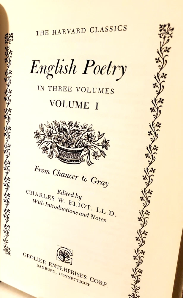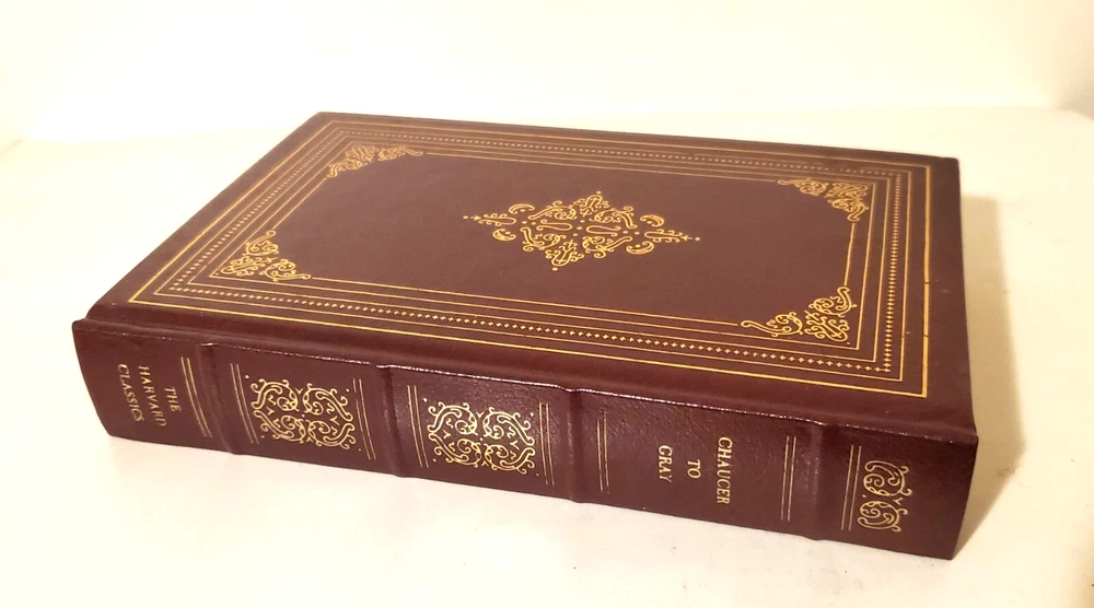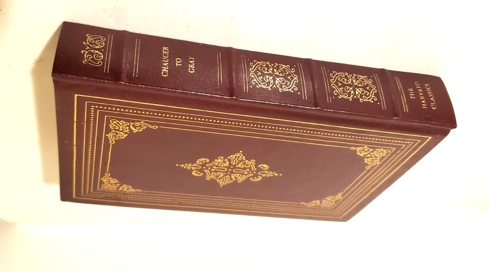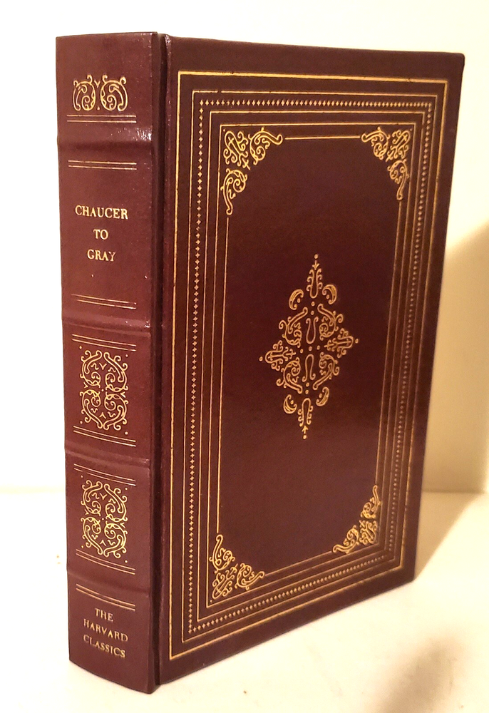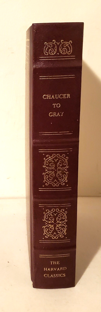ENGLISH POETRY Harvard Classics CHAUCER TO GRAY ENGLISH POETRY - CHAUCER TO GRAY ..... ...... This is one volume of English Poetry from the Harvard Classics three volume set ..... Published by Grolier in 1980......From the Harvard Classics......With Introduction and Notes . . .. . ... .. DESCRIPTION - The book is bound with a bonded leather cover, with gold letterin' on spine and cover, and marbled endpapers...And the pages are tipped in gold - and - it has a ribbon page markers.....Mercy !!!!...... .... CONDITION - The little rascal is in overall very good condition......The ages are good, with a fairly light scent, not sure what, but not offensive to me ......The cover is solid, with some wear and use......And the spine has a lean to it, which oughta go away when the book is placed on the shelf with other books ........This is a good, solid used book......And it looks real purty a-settin' on the shelf - good for display and readin'......I think you will be pleased with it .. ..... PAYMENT AND SHIPPIN' - 'Course the thrilled buyer is gonna hafta pay $4.95 for shippin' and handlin'.... ....Multiple purchases save on shippin'... ...Now while you're here, why don't you give my other auctions a look-see...Why, I 'spect I got a wagon load of mighty good books over yonder in my Book Barn... Thanks a heap....!! - - - ol' arkee
