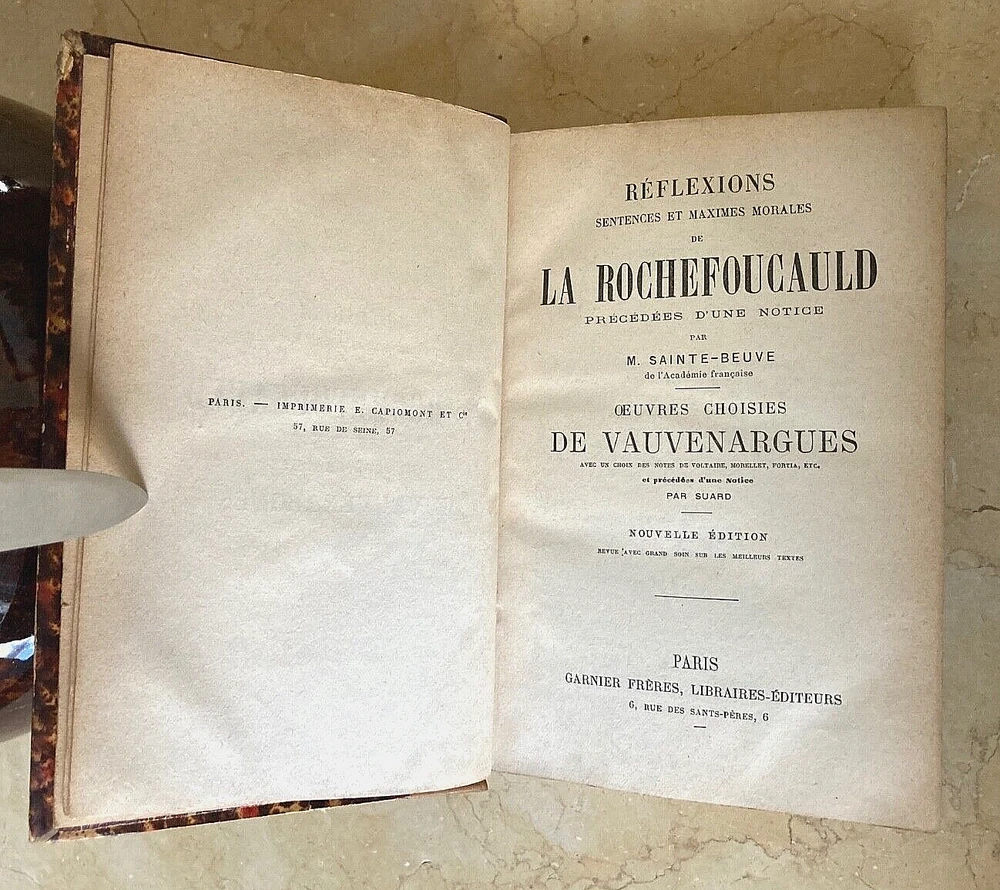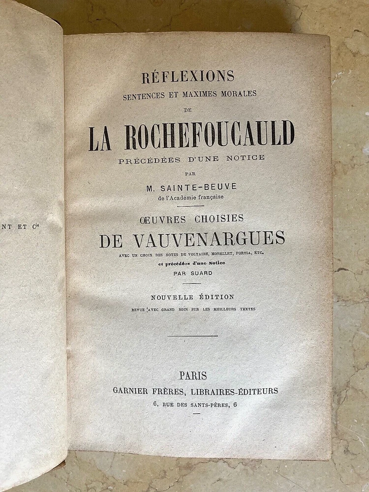 ORIGINAL! EX LIBRIS CONSTANCE PULITZER AUTOGRAPHED RÉFLEXIONS SENTENCES ET MAXIMES BOOK EX LIBRIS CONSTANCE PULITZER AUTOGRAPHED RÉFLEXIONS SENTENCES ET MAXIMES BOOK [ Constance Helen Pulitzer (b.1888-d.1938) daughter of Joseph Pulitzer and Kate Davis was fifth of seven siblings, though neither Lucille (#2) or Katherine (#3) made it to adulthood. In the 1900 census Constance (age 12) was the daughter of Joseph Pulitzer in Manhattan, New York City, New York, United States. , died (age 48) on 14 July 1938 in Manhattan, New York City, New York, United States.] Publisher: Garnier Frères Author: François VI,Duke of la Rochefoucauld Boldly autographed on the 1st inside blank right page : Constance Pulitzer ORIGINAL BOOK PLATE INSIDE FRONT COVER: EX LIBRIS CONSTANCE HELEN PULITZER CONDITION OF THE BOOK IS VERY FINE THROUGHOUT WITH SOME LIGHT HANDLING FROM ITS 157+ YEARS. DIMENSIONS: 4 3/4" x 6 15/16" LEATHER 1/2 BINDING WITH MARBLED BOARDS AND END PAPERS THIS IS NOT A REPRODUCTION OR COPY. PLEASE SEE MY 100% POSITIVE FEEDBACK AND BUY WITH CONFIDENCE