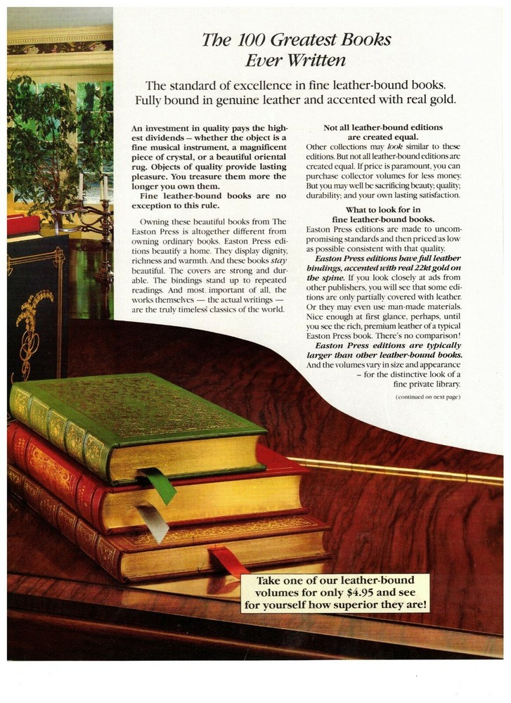 Easton Press 100 Greatest Works Leather Bound Editions Vintage 1990 Print Ad Vintage ads are nostalgic ephemera items that serve a variety of purposes, such as: Framed art Nostalgic gifts that remind us of special times, places, or items in the past Scrapbook, junk journal, and art journal materials Vision board inspiration Collectable items that can easily be stored in sheet-protected binders! Shipped with care, bagged and boarded. Be sure to see our many others and more to come in our store at Dream of the Past. https://www.ebay.com/str/dreamofthepast We are a trusted seller, check our feedback on our sister eBay store Robin's General Store, where we have been selling since 2009. Discounts on purchases of multiples with greatly reduced shipping cost.