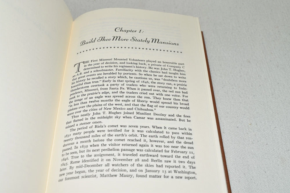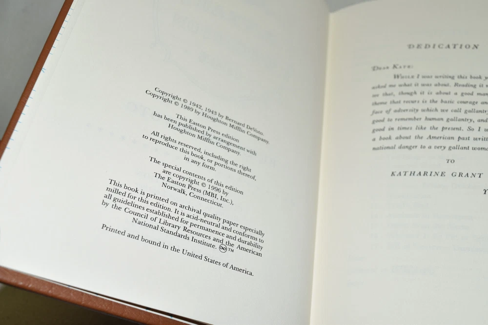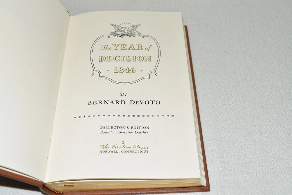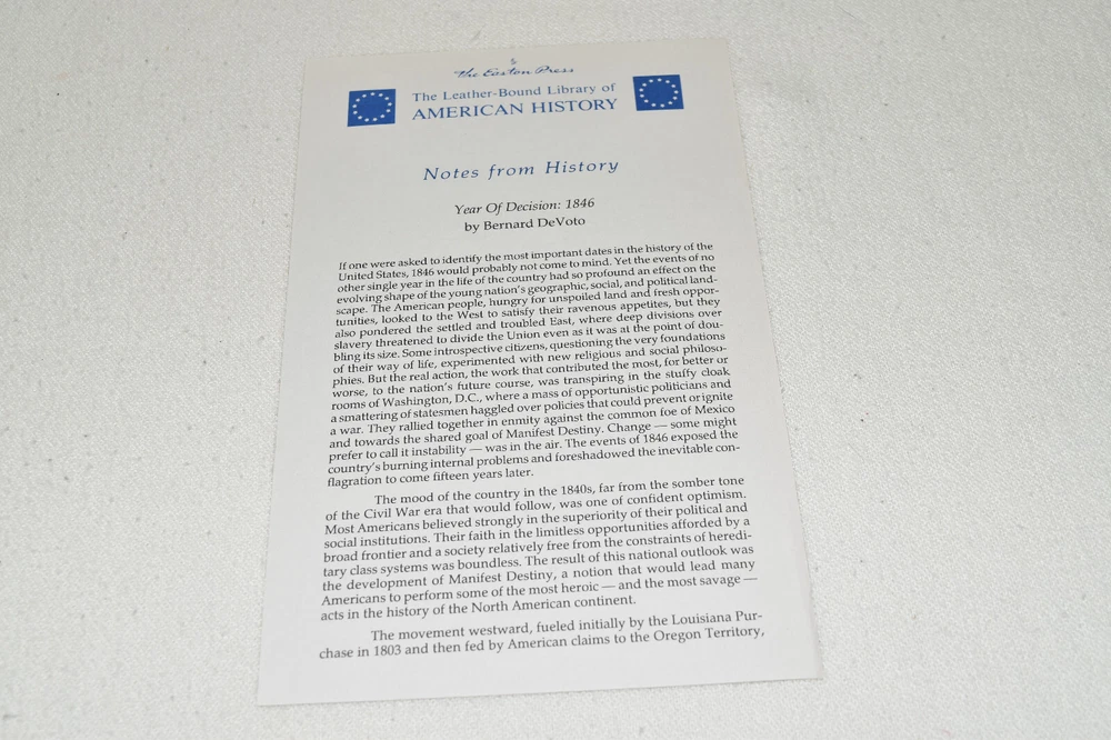 From the Easton Press Library of American History... The Year of Decision 1846 by Bernard DeVoto Collector's Edition Copyright 1996 by The Easton Press Bound in Premium Full Leather This volume contains all of the classic Easton Press trimmings: Premium Leather Decorated Endleaves Distinctive Cover Design Hubbed Spine, Accented in Real 22KT Gold Satin Ribbon Page Marker Gilded Page Edges Long-lasting, High Quality Acid-neutral Paper Smyth-sewn Pages for Strength and Durability Beautiful Illustrations A very scarce title in any condition, this Easton Press Edition is in Fine condition. The front and back covers are both in terrific condition and the gilded page edges show minor wear on the bottom edge (see pictures of all sides of gilt). There is faint residue on the second page. This book is part of the Library of American History Collection published by Easton Press. It comes complete with Collector's Notes and would be a beautiful addition to your Easton Press collection. Please Email Me With Any Questions You Might Have! Shipping Info: Buyer to Pay Shipping and Handling International Bidders Pay Extra Shipping Seller Not Responsible For Uninsured Items Lost or Damaged in Mail Forms of Payment Accepted: Paypal Good luck and happy bidding! Powered by eBay Turbo Lister The free listing tool. List your items fast and easy and manage your active items.