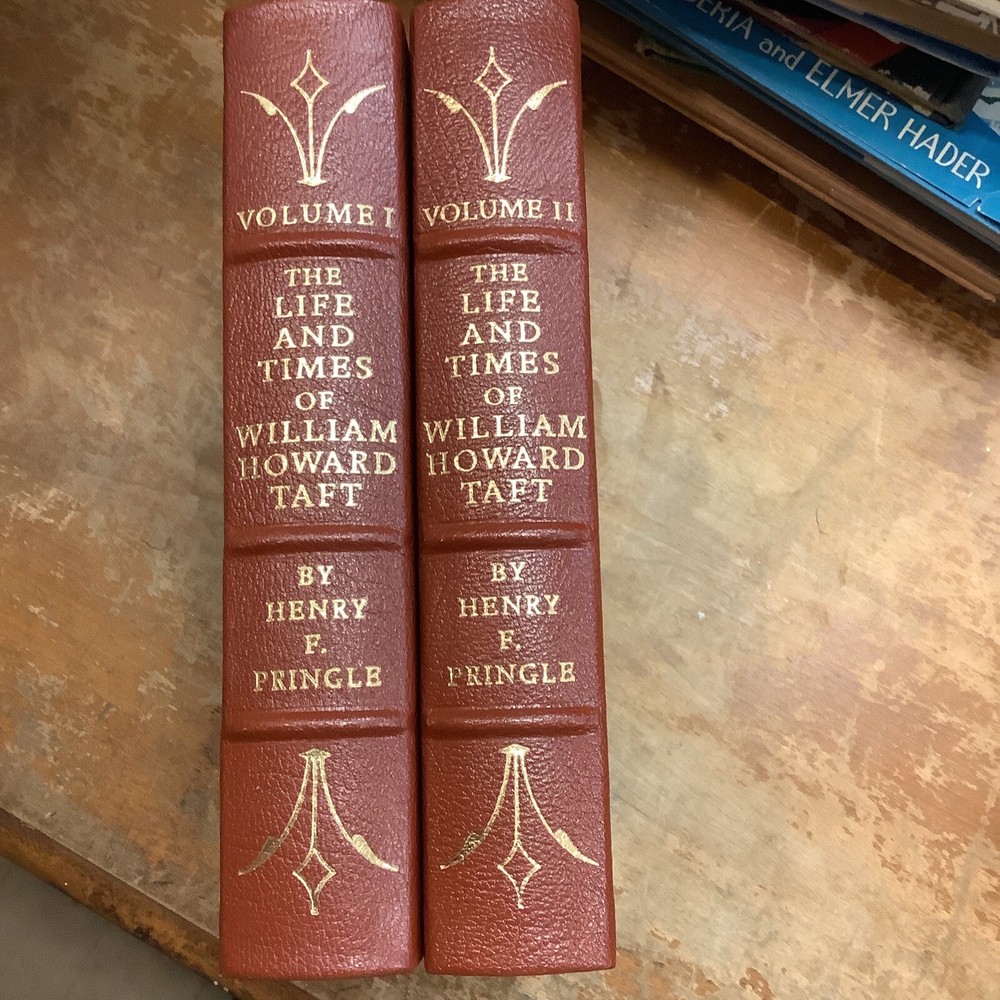 The Life and Times of William Howard Taft by Henry F. Pringle. Two volume full leather set published by The Easton Press in 1986. Full leather bindings with gilt lettering and decorations, page edges gilt, ribbon page marker. No markings. Sheet of Collector's Notes and blank Easton Press book plate are laid into each volume.