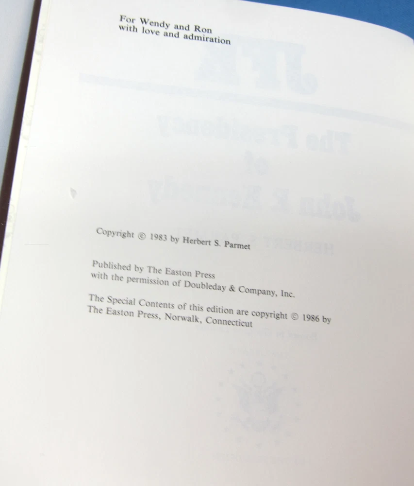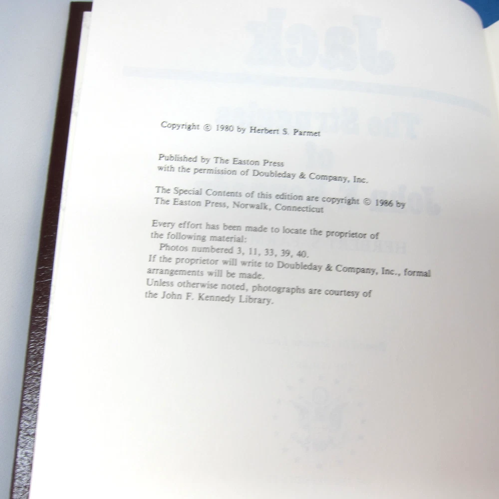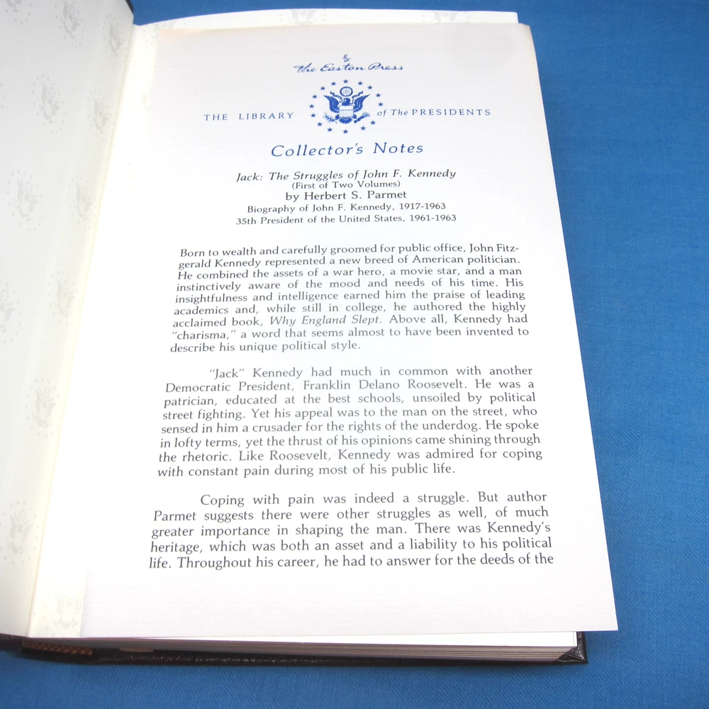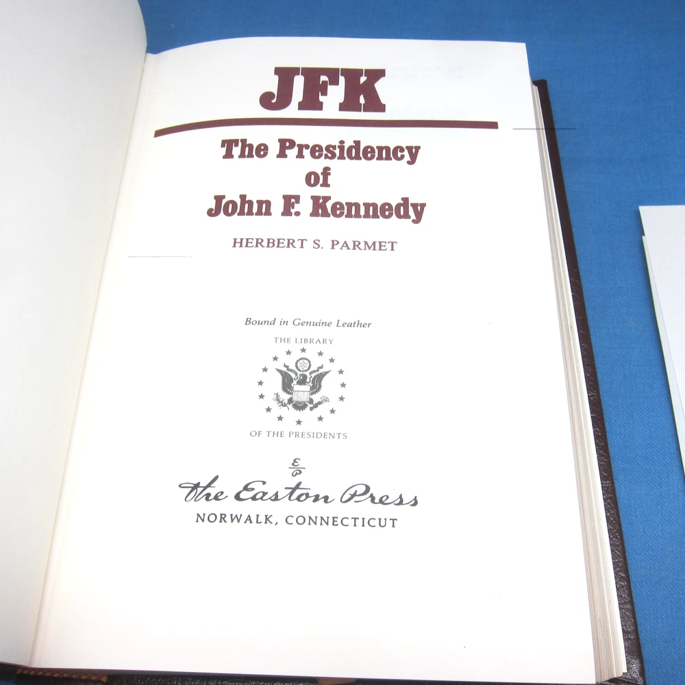 Jack and JFK, 2 volume set by Herbert S. Parmet, leather-bound, gilt edged and decor from Easton Press. Collector's Notes are included in both volumes, and 1 unused bookplate.