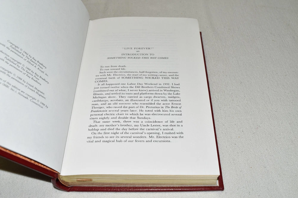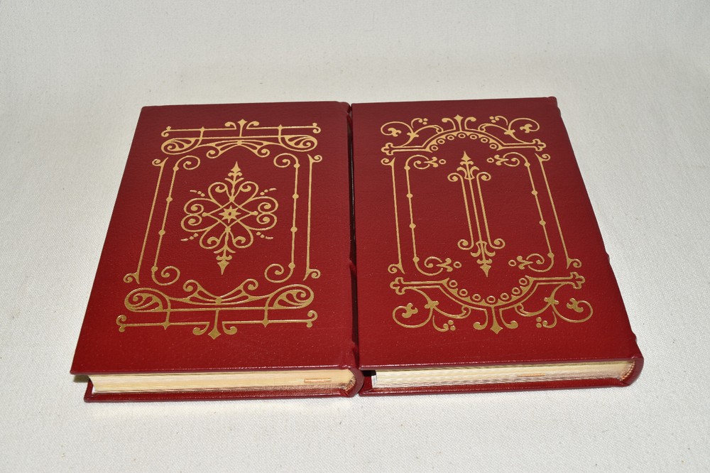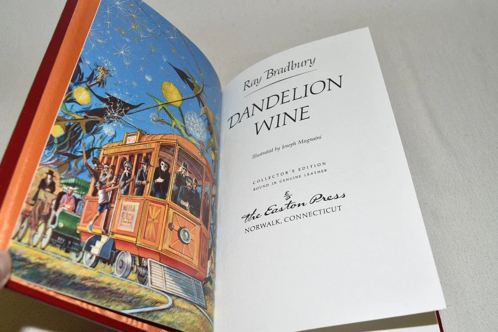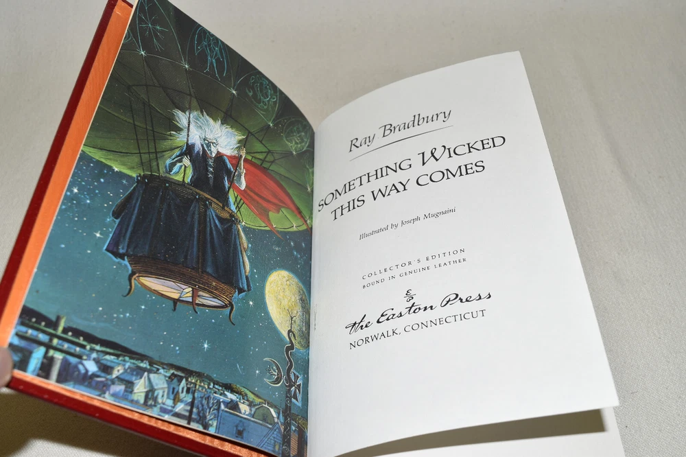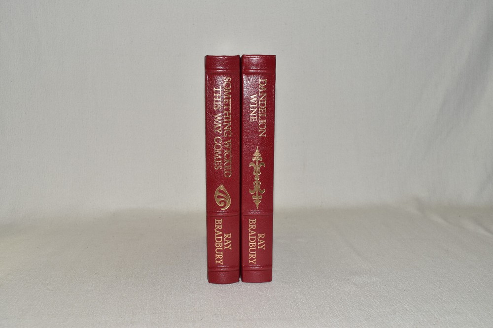 From the Easton Press Collection... Dandelion Wine Something Wicked This Way Comes Two Volume Matching Set by Ray Bradbury Illustrated by Joseph Mugnaini Copyright 1988 by The Easton Press Bound in Premium Full Leather This set contains all of the classic Easton Press trimmings: Premium Leather Silk Moire Endleaves Distinctive Cover Design Hubbed Spine, Accented in Real 22KT Gold Satin Ribbon Page Marker Gilded Page Edges Long-lasting, High Quality Acid-neutral Paper Smyth-sewn Pages for Strength and Durability Beautiful Illustrations This set is in Near Fine condition. The front and back covers are both in near perfect condition and gilded page edges show minor rubbing on Dandelion Wine (see pictures of all sides). There is faint bookplate residue on the second pages. This set is part of the Easton Press Collection and would be a beautiful addition to your Easton Press collection. Hopefully you can add this set to your collection and enjoy it in the years to come... Please Email Me With Any Questions You Might Have! Shipping Info: Buyer to Pay Shipping & Handling International Bidders Pay Extra Shipping Good luck and happy bidding!