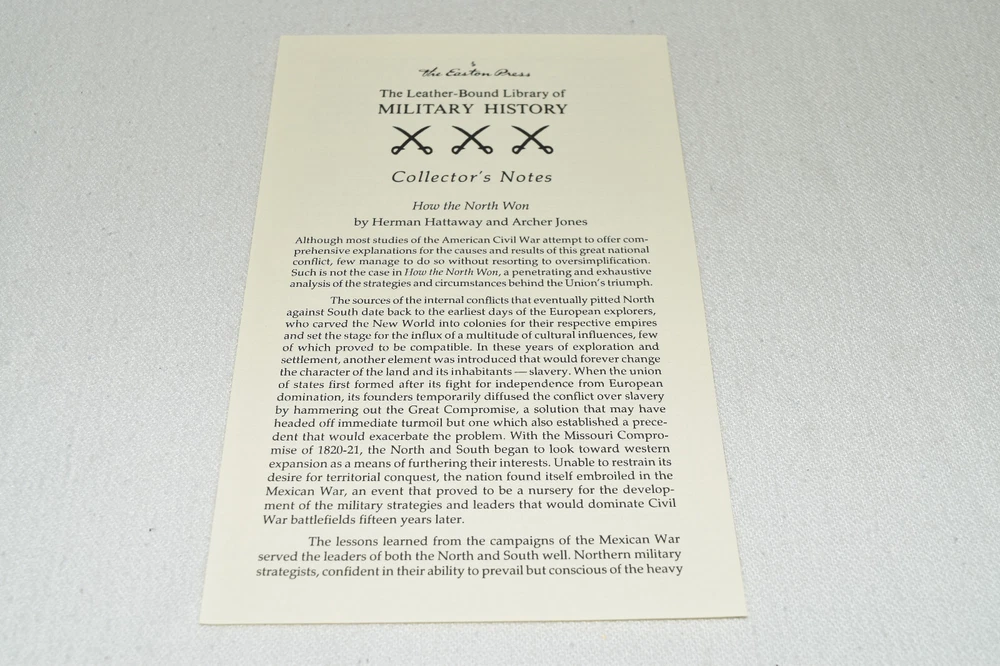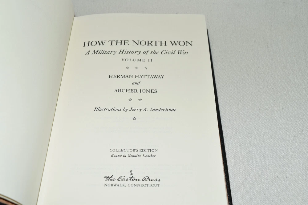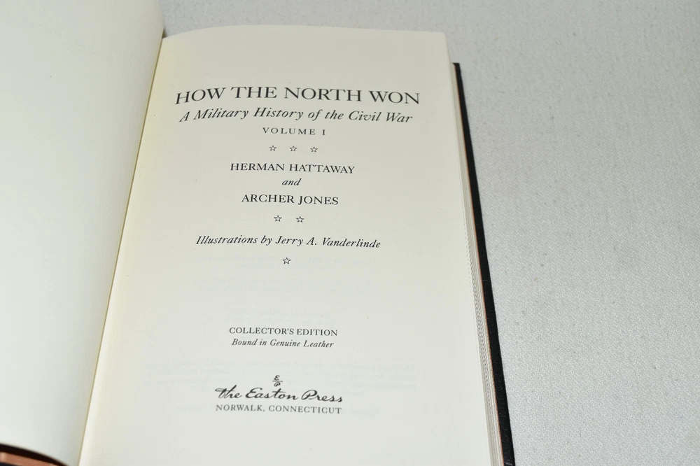 From the Easton Press Library of Military History Collection... How the North Won A Military History of The Civil War Two Volume Set by Herman Hattaway and Archer Jones Copyright 1996 by The Easton Press Bound in Premium Full Leather This volume contains all of the classic Easton Press trimmings: Premium Leather Silk Moire Endleaves Distinctive Cover Design Hubbed Spine, Accented in Real 22KT Gold Satin Ribbon Page Marker Gilded Page Edges Long-lasting, High Quality Acid-neutral Paper Smyth-sewn Pages for Strength and Durability Beautiful Illustrations A very scarce title in any condition, this set is in Fine condition. The front and back covers are both in terrific condition showing light wear and the gilded page edges show hardly any wear (see pictures of all edges). There is faint residue on the second pages. This set is part of the Library of Military History Collection published by Easton Press. It comes complete with Collector's Notes and would be a beautiful addition to your Easton Press collection. Hopefully you can add this set to your collection and enjoy it in the years to come... Please Email Me With Any Questions You Might Have! Shipping Info: Buyer to Pay Shipping and Handling International Bidders Pay Extra Shipping Seller Not Responsible For Uninsured Items Lost or Damaged in Mail Forms of Payment Accepted: Paypal Good luck and happy bidding! Powered by eBay Turbo Lister The free listing tool. List your items fast and easy and manage your active items.