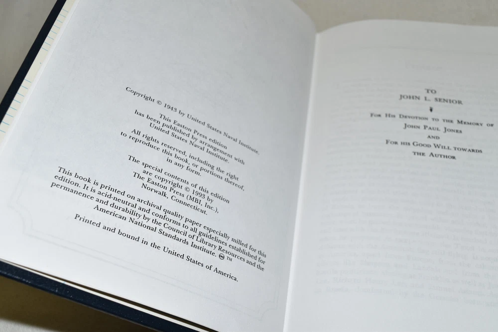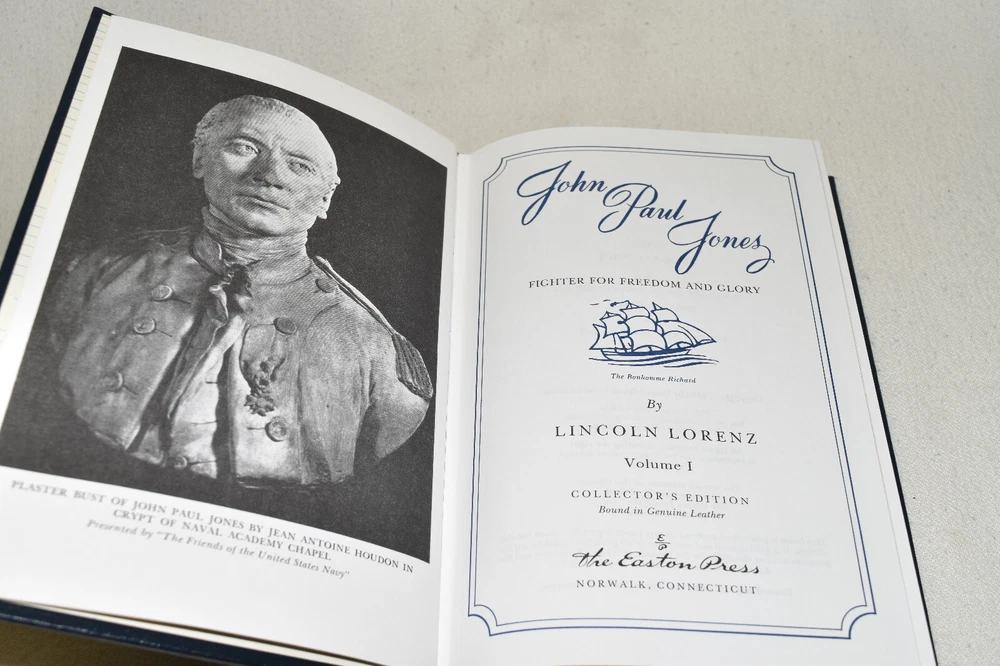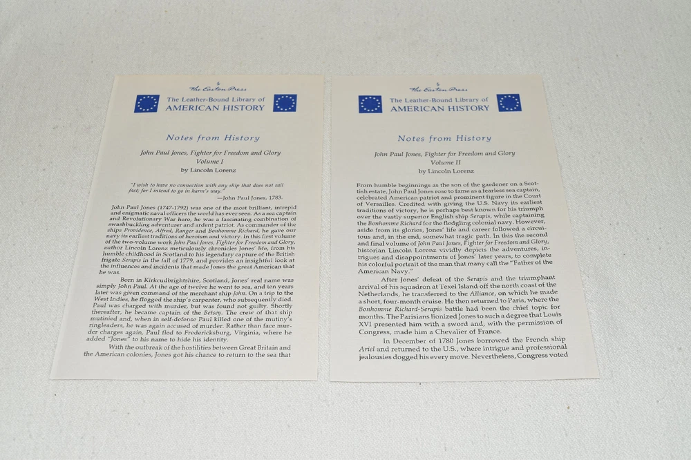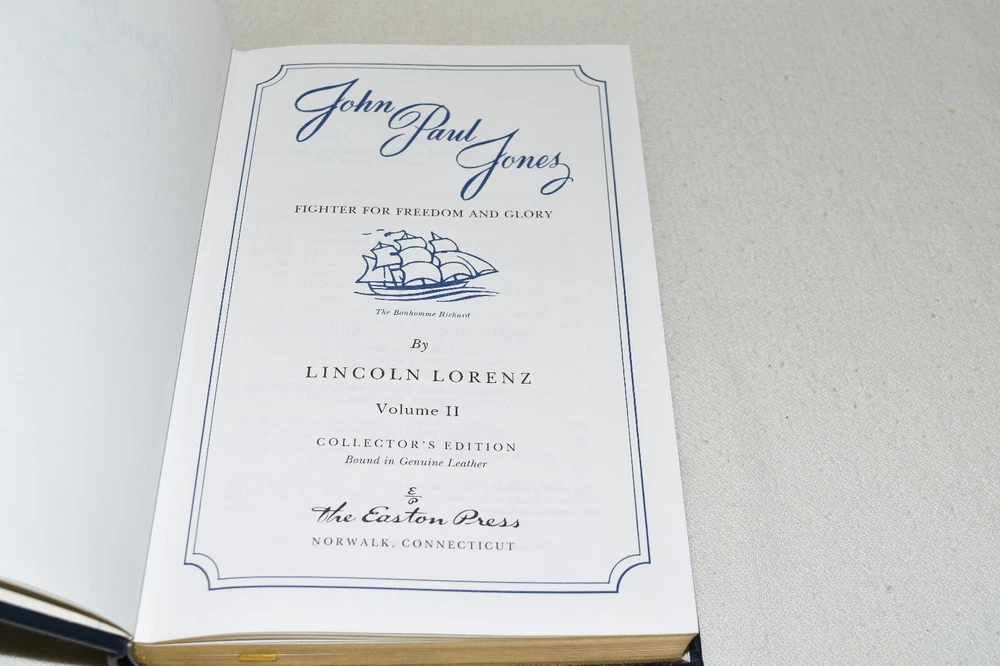 From the Easton Press Library of American History... John Paul Jones Fighter for Freedom and Glory Complete Two-Volume Set by Lincoln Lorenz Collector's Edition Copyright 1993 by The Easton Press Bound in Premium Full Leather This set contains all of the classic Easton Press trimmings: Premium Leather Decorated Endleaves Distinctive Cover Design Hubbed Spine, Accented in Real 22KT Gold Satin Ribbon Page Marker Gilded Page Edges Long-lasting, High Quality Acid-neutral Paper Smyth-sewn Pages for Strength and Durability Beautiful Illustrations A very scarce set in any condition, this Easton Press Edition is in Fine condition. The front and back covers are both in terrific condition and the gilded page edges show only minor wear (see pictures of all sides of gilt). There is faint residue on the second pages. This set is part of the Library of American History Collection published by Easton Press. It comes complete with Collector's Notes and would be a beautiful addition to your Easton Press collection. Please Email Me With Any Questions You Might Have! Shipping Info: Buyer to Pay Shipping and Handling International Bidders Pay Extra Shipping Seller Not Responsible For Uninsured Items Lost or Damaged in Mail Forms of Payment Accepted: Paypal Good luck and happy bidding! Powered by eBay Turbo Lister The free listing tool. List your items fast and easy and manage your active items.