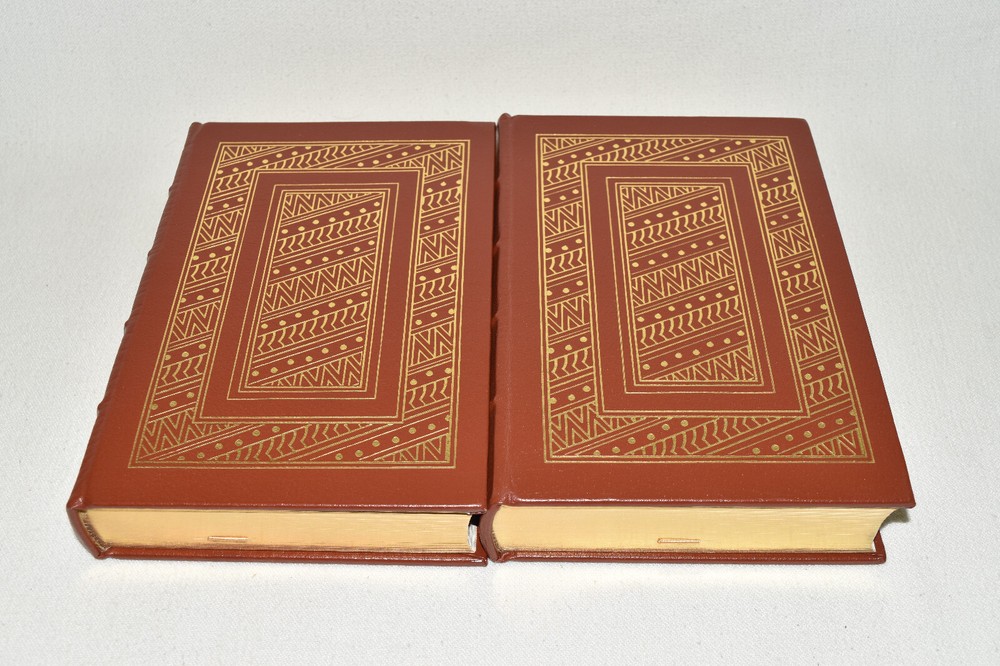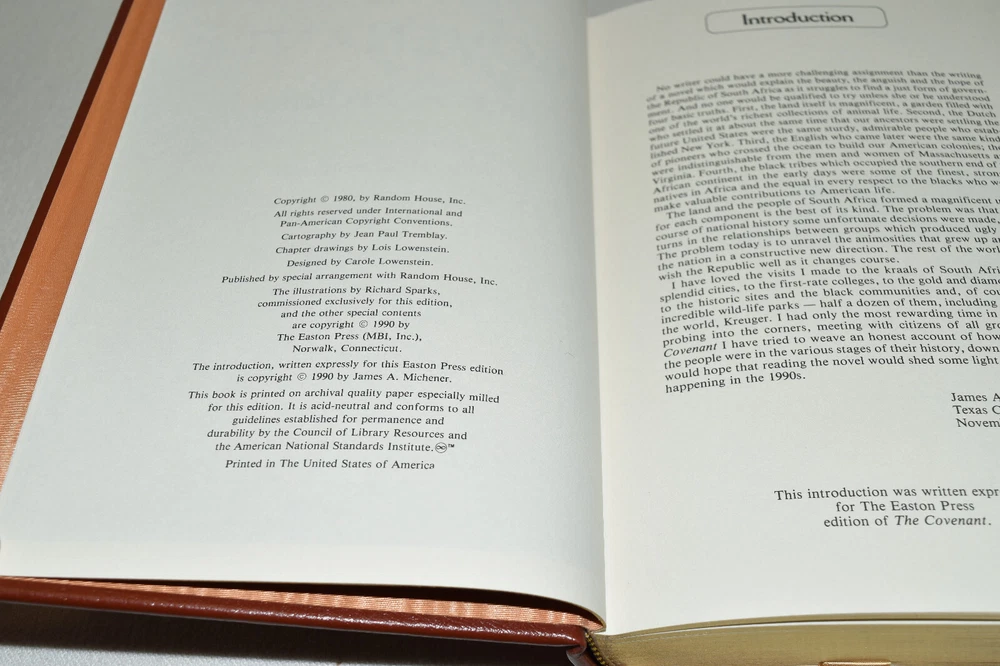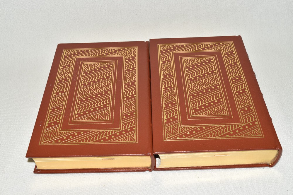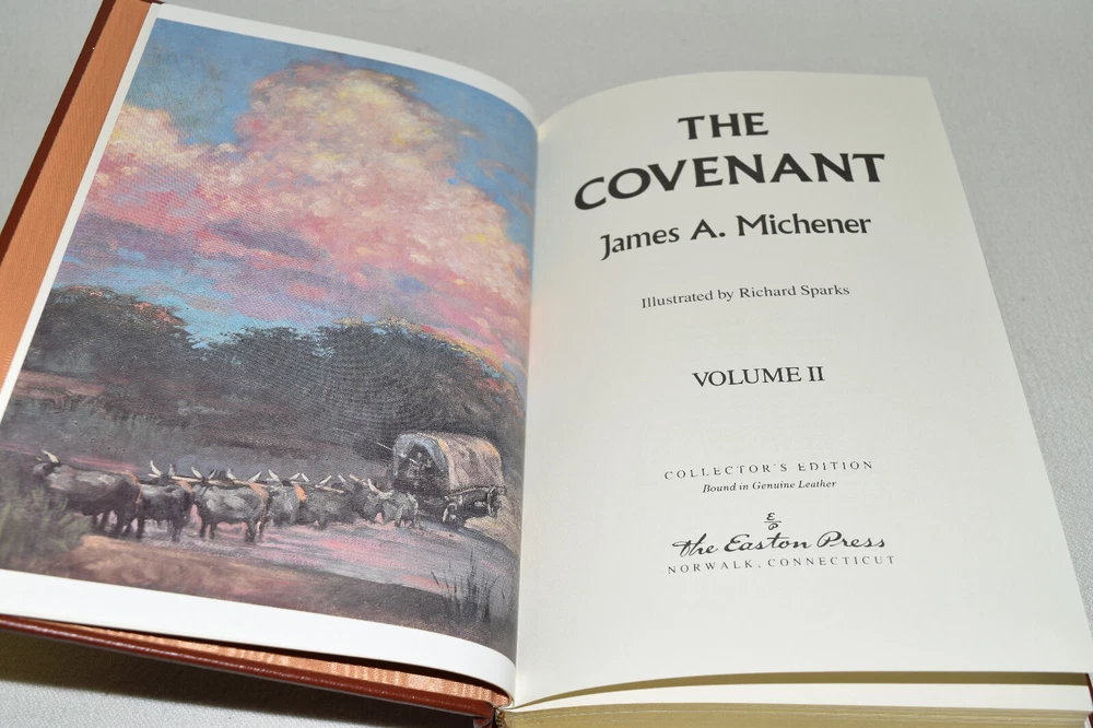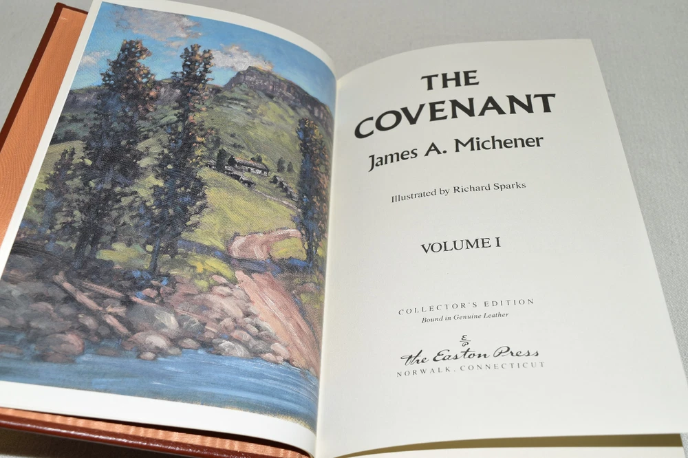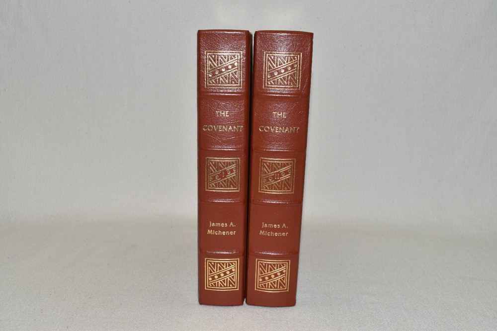 From the Easton Press Collection... The Covenant Two Volume Matching Set by James Michener Illustrated by Richard Sparks Copyright 1990 by The Easton Press Bound in Premium Full Leather This set contains all of the classic Easton Press trimmings: Premium Leather Silk Moire Endleaves Distinctive Cover Design Hubbed Spine, Accented in Real 22KT Gold Satin Ribbon Page Marker Gilded Page Edges Long-lasting, High Quality Acid-neutral Paper Smyth-sewn Pages for Strength and Durability Beautiful Illustrations This set is in Near Fine / Fine condition. The front and back covers are both in terrific condition with V1 showing light spotting on the back cover and gilded page edges show hardly any wear (see pictures of all sides). There are no markings, or other signs of prior ownership in either book. This set is part of the Easton Press Collection and would be a beautiful addition to your Easton Press collection. Hopefully you can add this set to your collection and enjoy it in the years to come... Please Email Me With Any Questions You Might Have! Shipping Info: Buyer to Pay Shipping & Handling International Bidders Pay Extra Shipping Good luck and happy bidding!