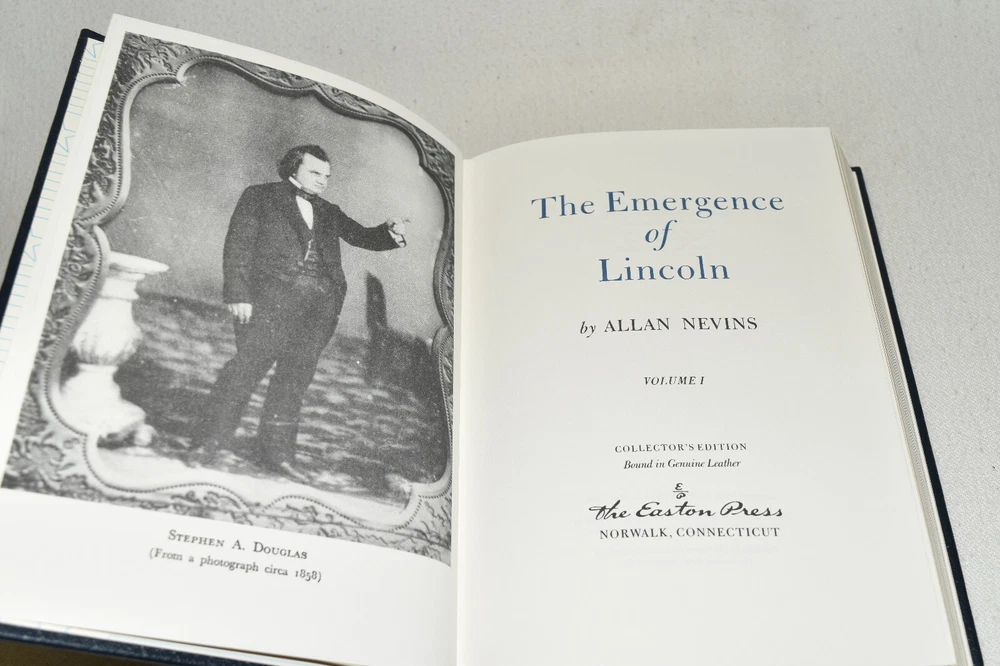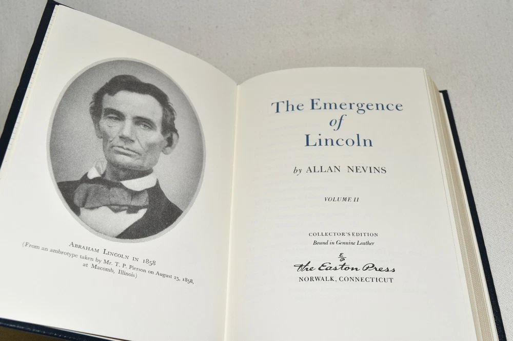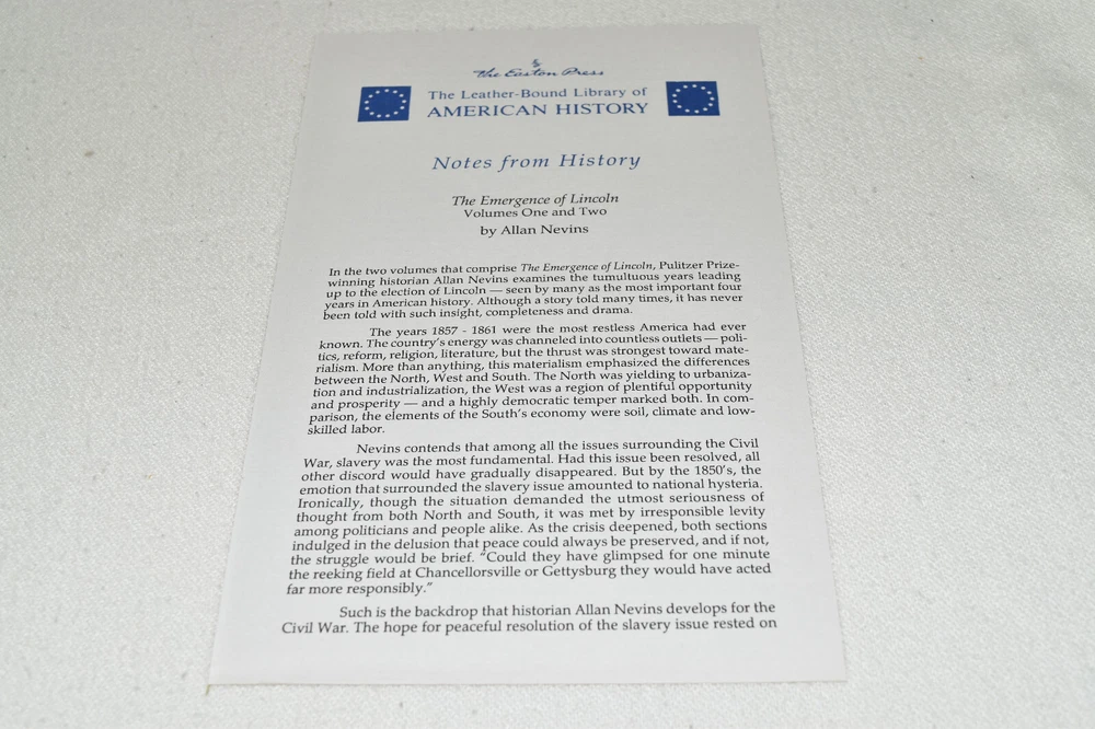 From the Easton Press Library of American History... The Emergence of Lincoln Complete Two-Volume Set by Allan Nevins Collector's Edition Copyright 1988 by The Easton Press Bound in Premium Full Leather This set contains all of the classic Easton Press trimmings: Premium Leather Decorated Endleaves Distinctive Cover Design Hubbed Spine, Accented in Real 22KT Gold Satin Ribbon Page Marker Gilded Page Edges Long-lasting, High Quality Acid-neutral Paper Smyth-sewn Pages for Strength and Durability Beautiful Illustrations A very scarce set in any condition, this Easton Press Edition is in Fine condition. The front and back covers are both in terrific condition and the gilded page edges show only minor wear (see pictures of all sides of gilt). There is faint residue on the second pages. This set is part of the Library of American History Collection published by Easton Press. It comes complete with Collector's Notes and would be a beautiful addition to your Easton Press collection. Please Email Me With Any Questions You Might Have! Shipping Info: Buyer to Pay Shipping and Handling International Bidders Pay Extra Shipping Seller Not Responsible For Uninsured Items Lost or Damaged in Mail Forms of Payment Accepted: Paypal Good luck and happy bidding! Powered by eBay Turbo Lister The free listing tool. List your items fast and easy and manage your active items.