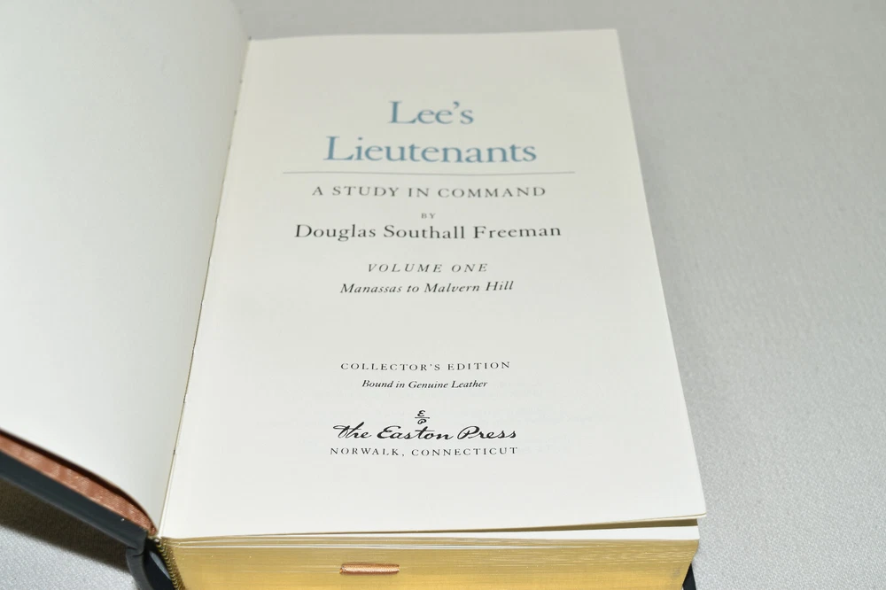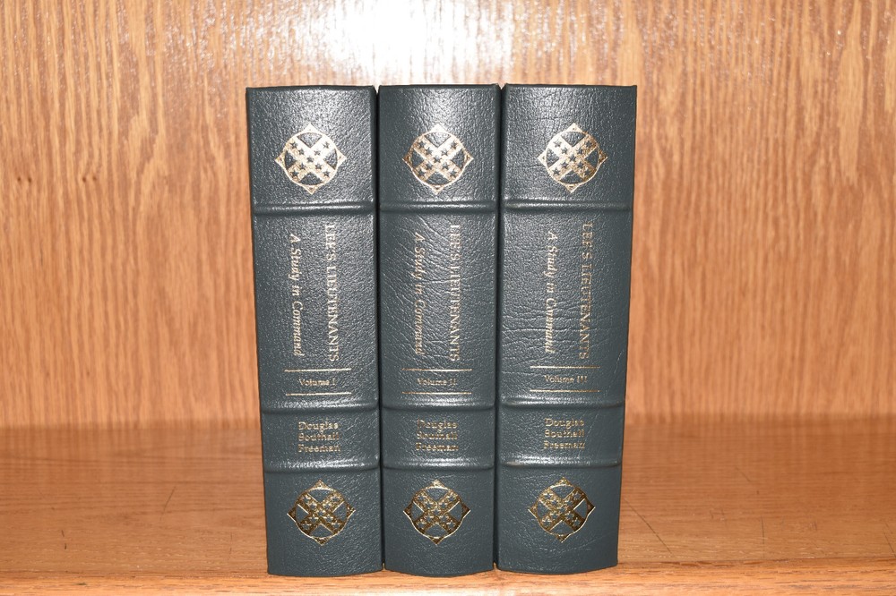 From the Easton Press Library Collection... Lee's Lieutenant's Three Volume Matching Set by Douglas Southall Freeman Copyright 1991 by The Easton Press Bound in Premium Full Leather This volume contains all of the classic Easton Press trimmings: Premium Leather Silk Moire Endleaves Distinctive Cover Design Hubbed Spine, Accented in Real 22KT Gold Satin Ribbon Page Marker Gilded Page Edges Long-lasting, High Quality Acid-neutral Paper Smyth-sewn Pages for Strength and Durability Beautiful Illustrations This set is in Fine condition. The front and back boards are in terrific condition and the gilded page edges show hardly any minor wear (see pictures of all sides). There is no markings, bookplates, or other signs of prior ownership in these books. This set would be a beautiful addition to your Easton Press collection. Overall, this is a grade collector's set. It is very elusive in this superior condition, as only a limited number of them were ever published, so now is the time to act. Hopefully you can add this set to your collection and enjoy it in the years to come... Please Email Me With Any Questions You Might Have! Shipping Info: Buyer to Pay Shipping & Handling International Bidders Pay Extra Shipping Good luck and happy bidding!