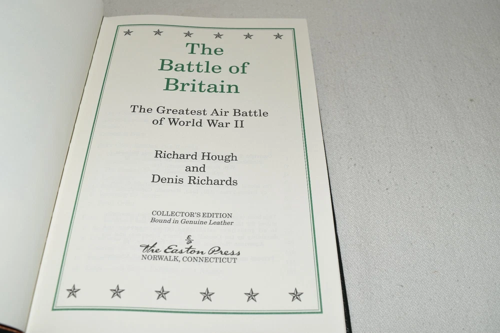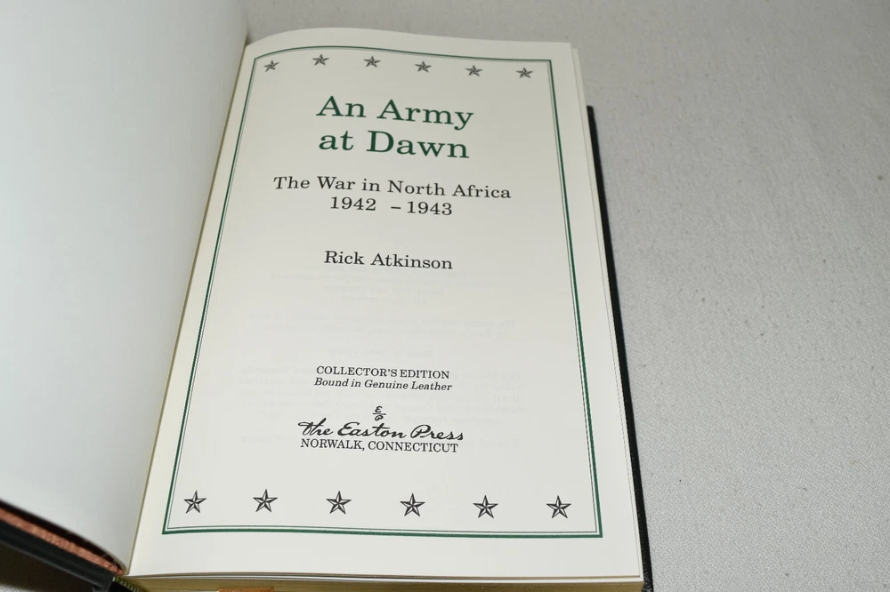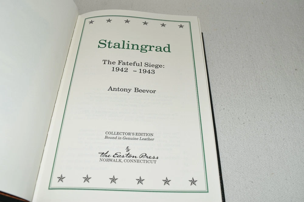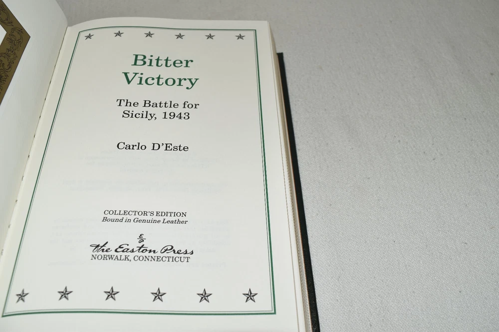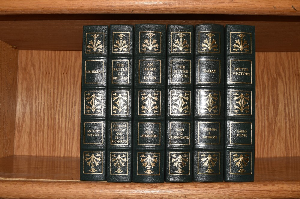 From the Easton Press Collection... D-Day by Stephen E. Ambrose The Battle of Britain by Richard Hough and Denis Richards Stalingrad by Antony Beevor The Bitter Woods by John S. D. Eisenhower An Army at Dawn by Rick Atkinson Bitter Victory by Carlo D'Este Complete Six-Volume Set Beautifully Illustrated with Maps and Photos Copyright 2004 by The Easton Press Bound in Premium Full Leather This volume contains all of the classic Easton Press trimmings: Premium Leather Decorated Endleaves Distinctive Cover Design Hubbed Spine, Accented in Real 22KT Gold Satin Ribbon Page Marker Gilded Page Edges Long-lasting, High Quality Acid-neutral Paper Smyth-sewn Pages for Strength and Durability Beautiful Illustrations A very scarce set in any condition, these volumes are in Fine condition. The front and back covers are both in terrific condition and the gilded page edges show minor wear (see pictures of all edges). There are blank bookplates on the second page of each book except for D-Day. This set was published by Easton Press and would be a beautiful addition to your Easton Press collection. Hopefully you can add this set to your collection and enjoy it in the years to come... Please Email Me With Any Questions You Might Have! Shipping Info: Buyer to Pay Shipping and Handling International Bidders Pay Extra Shipping Seller Not Responsible For Uninsured Items Lost or Damaged in Mail Good luck and happy bidding! \
