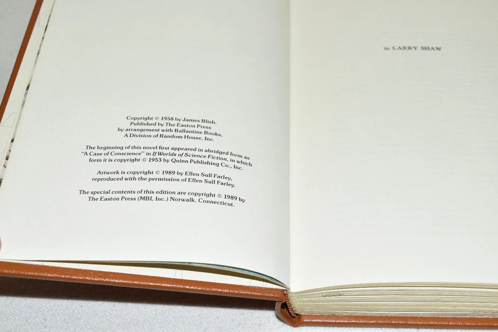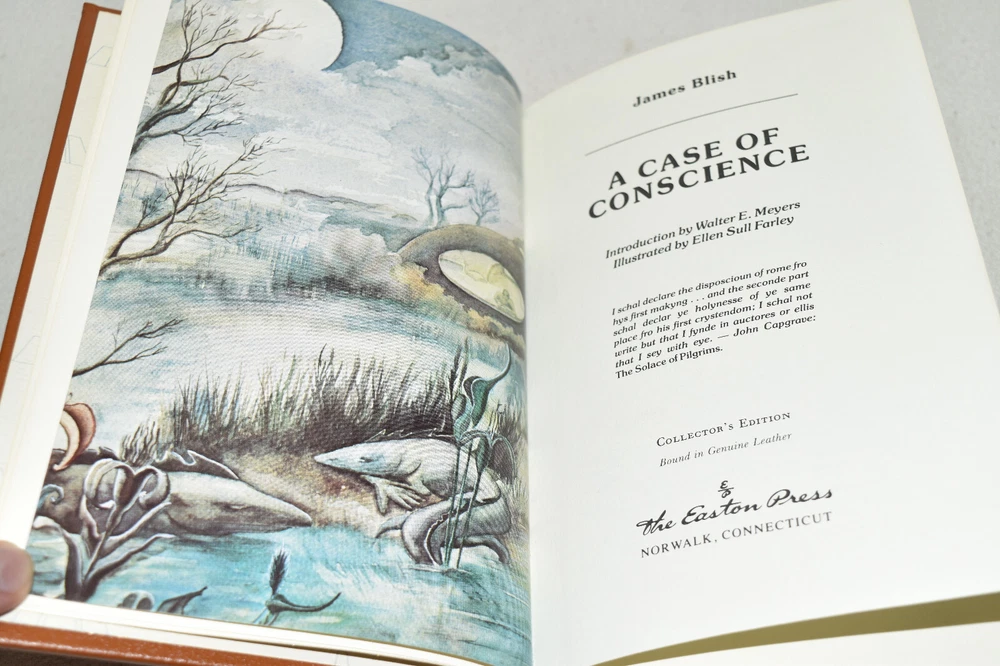 From the Easton Press Masterpieces of Science Fiction Collection... A Case of Conscience by James Blish Illustrated by Ellen Farley Collector's Edition Copyright 1989 by The Easton Press Bound in Premium Full Leather This volume contains all of the classic Easton Press trimmings: Premium Leather Silk Moire Endleaves Distinctive Cover Design Hubbed Spine, Accented in Real 22KT Gold Satin Ribbon Page Marker Gilded Page Edges Long-lasting, High Quality Acid-neutral Paper Smyth-sewn Pages for Strength and Durability Beautiful Illustrations A very scarce title in any condition, this 1989 Easton Press Edition is in Excellent condition. The front and back covers are both in terrific condition showing minor fading and the gilded page edges show minor wear (see pictures of all sides of gilt). There is no attached bookplate nor any other signs of previous ownership . This book is part of the Masterpieces of Science Fiction Collection published by Easton Press and would be a beautiful addition to your Easton Press collection. Please Email Me With Any Questions You Might Have! Shipping Info: Buyer to Pay Shipping and Handling International Bidders Pay Extra Shipping Seller Not Responsible For Uninsured Items Lost or Damaged in Mail Forms of Payment Accepted: Paypal Good luck and happy bidding! Powered by eBay Turbo Lister The free listing tool. List your items fast and easy and manage your active items.
