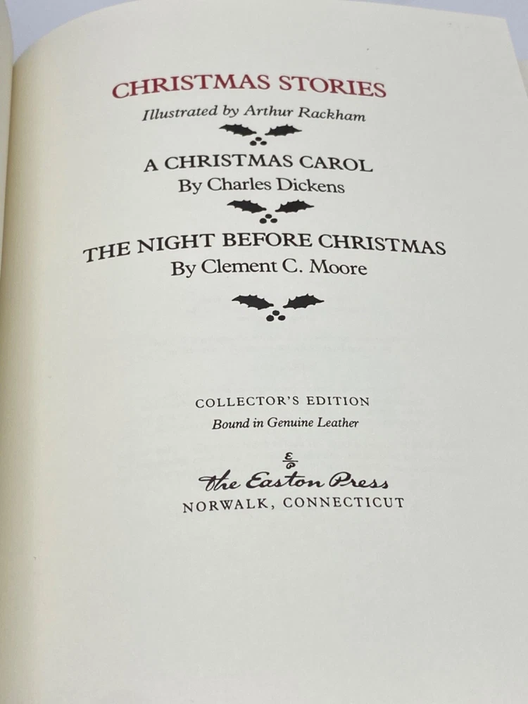 MAKES THE PERFECT GIFT FOR ANY FANS OF THE CLASSICS / CHARLES DICKENS / CHRISTMAS / CLEMENT C. MOORE ** PLEASE READ : Mahalo for taking the time to look at our listing. We truly appreciate it. We always do our BEST to give you the most accurate description of these beautiful books. If, however, you have any SPECIFIC questions about the SIZE of the book, NUMBER of pages, TYPE of leather, SMELL or FEEL of the book, PLEASE email us through EBay’s mail system BEFORE you bid, and we will be HAPPY to give you more information. We want you to be completely happy with your purchase and keep you as our customers for years to come!** DESCRIPTION: Easton Press’s LONG OUT OF PRINT dual edition of A CHRISTMAS CAROL & THE NIGHT BEFORE CHRISTMAS by CHARLES DICKENS. THIS IS A SCARCE, VINTAGE ONE OF THE MOST DIFFICULT TO FIND EDITIONS OF THESE CLASSIC CHRISTMAS TALES with THE INCREDIBLE ARTWORK OF ARTHUR RACKHAM . IT IS ONE OF THE MOST HIGHLY-PRIZED & MOST BEAUTIFUL EDITIONS OF THESE CLASSICS YOU CAN FIND. 🍍 NOT INCLUDED… 😃 ABOUT THE BOOK: This gorgeously illustrated, gilt-edged edition of the classic Christmas story and poem will be a treasured memento of holiday celebrations for years to come. The timeless tale of Ebenezer Scrooge and Moore's classic poem are among the most beloved Christmas stories of all time, and this elegant leather-bound edition is perfect to give as a gift or as an addition to one's own collection. CONDITION: Book is in LIKE NEW condition for its age with only a couple of minor rubs to the gilt page ends (SEE PICS FOR BETTER DETAILS). NO ATTACHED BOOKPLATES, WRITING FROM PREVIOUS OWNER, ETC. It is a SPECTACULAR EDITION. SHIPPING: FREE TO U.S. ADDRESSES ONLY . INTERNATIONAL $ based on location. WE SHIP PRIORITY MAIL & PACK VERY WELL. Please check out our other listings of Easton Press, Franklin Library, Limited Editions Club, First Edition Library, Heritage Press, International Collectors Library, and Folio Society editions. WE DO COMBINE SHIPPING IF YOU PURCHASE MORE THAN ONE COPY. Mahalo for looking at our listings! By bidding/purchasing this item, you are helping a very grateful family who sends you our WARMEST ALOHA & MAHALO!