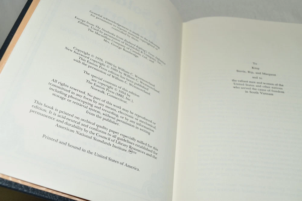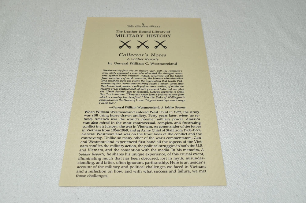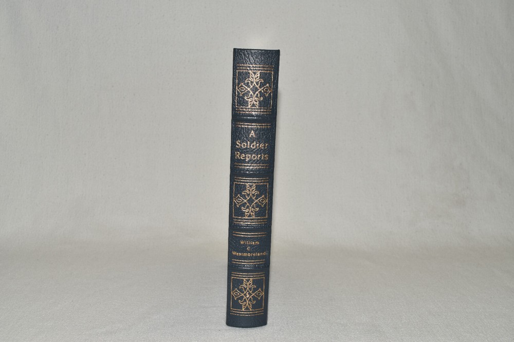 From the Easton Press Library of Military History Collection... A Soldier Reports by General William C. Westmoreland Profusely Illustrated! Copyright 1994 by The Easton Press Bound in Premium Full Leather This volume contains all of the classic Easton Press trimmings: Premium Leather Silk Moire Endleaves Distinctive Cover Design Hubbed Spine, Accented in Real 22KT Gold Satin Ribbon Page Marker Gilded Page Edges Long-lasting, High Quality Acid-neutral Paper Smyth-sewn Pages for Strength and Durability Beautiful Illustrations A very scarce title in any condition, this volume is in Fine condition. The front and back covers are both in terrific condition and the gilded page edges show only minor wear (see pictures of all edges). There is light residue on the second page. This book is part of the Library of Military History Collection published by Easton Press. It comes complete with Collector's Notes and would be a beautiful addition to your Easton Press collection. Please Email Me With Any Questions You Might Have! Shipping Info: Buyer to Pay Shipping and Handling International Bidders Pay Extra Shipping Seller Not Responsible For Uninsured Items Lost or Damaged in Mail Forms of Payment Accepted: Paypal Good luck and happy bidding! Powered by eBay Turbo Lister The free listing tool. List your items fast and easy and manage your active items.