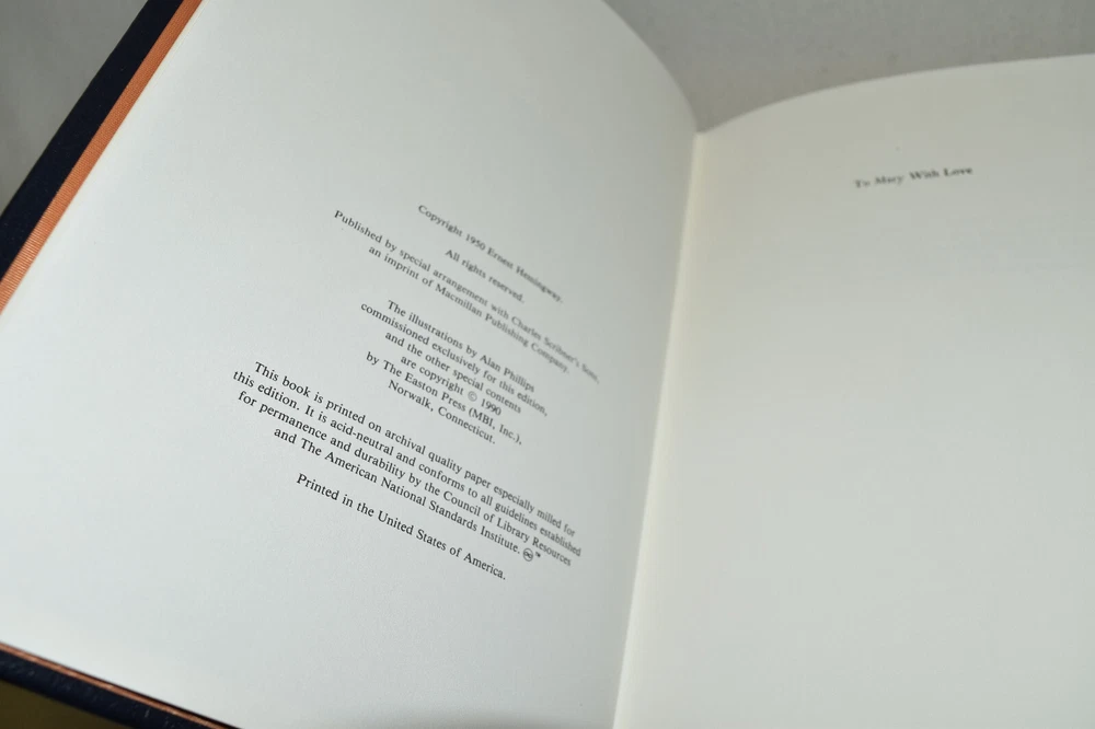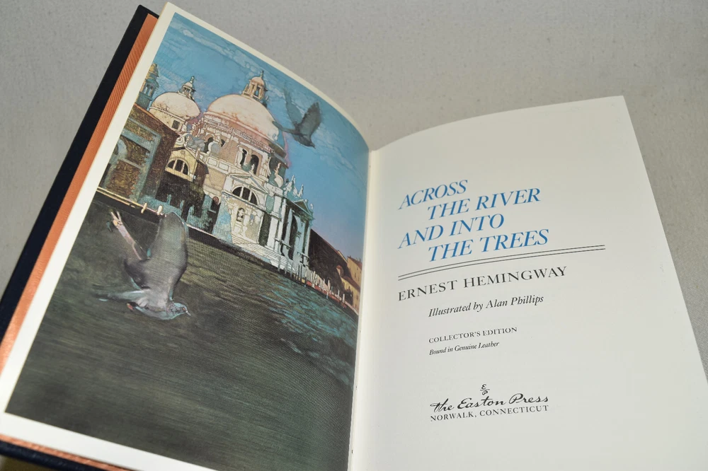 From the Easton Press Collection... Across the River and Into the Trees by Ernest Hemingway Illustration by Alan Phillips C ollector's Edition Copyright 1990 by The Easton Press Bound in Premium Full Leather This volume contains all of the classic Easton Press trimmings: Premium Leather Silk Moire Endleaves Distinctive Cover Design Hubbed Spine, Accented in Real 22KT Gold Satin Ribbon Page Marker Gilded Page Edges Long-lasting, High Quality Acid-neutral Paper Smyth-sewn Pages for Strength and Durability Beautiful Illustrations A very scarce title in any condition, this Easton Press First Limited Edition is in Near Fine - Fine condition. The front and back covers are both in terrific condition and the gilded page edges show minor wear on the top edge (see pictures of all gilt sides). There are no markings, bookplates, or other signs of prior ownership in this book. This book was published by Easton Press and would be a beautiful addition to your Easton Press collection. Hopefully you can add this book to your collection and enjoy it in the years to come... Please Email Me With Any Questions You Might Have! Shipping Info: Buyer to Pay Shipping and Handling International Bidders Pay Extra Shipping Seller Not Responsible For Uninsured Items Lost or Damaged in Mail Forms of Payment Accepted: Paypal Good luck and happy bidding! Powered by eBay Turbo Lister The free listing tool. List your items fast and easy and manage your active items.