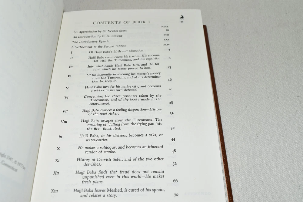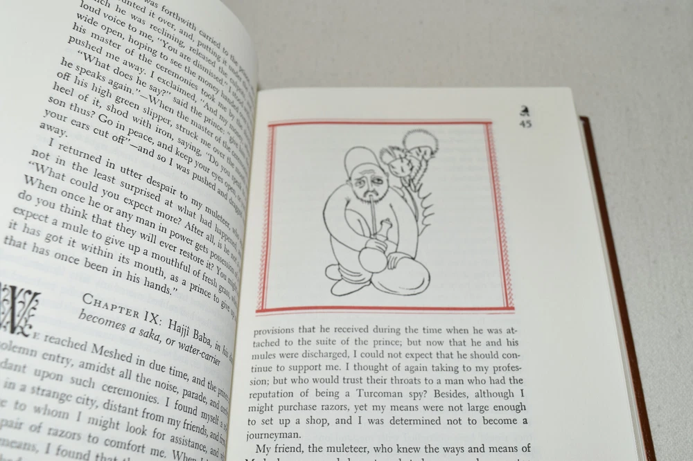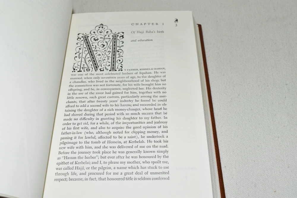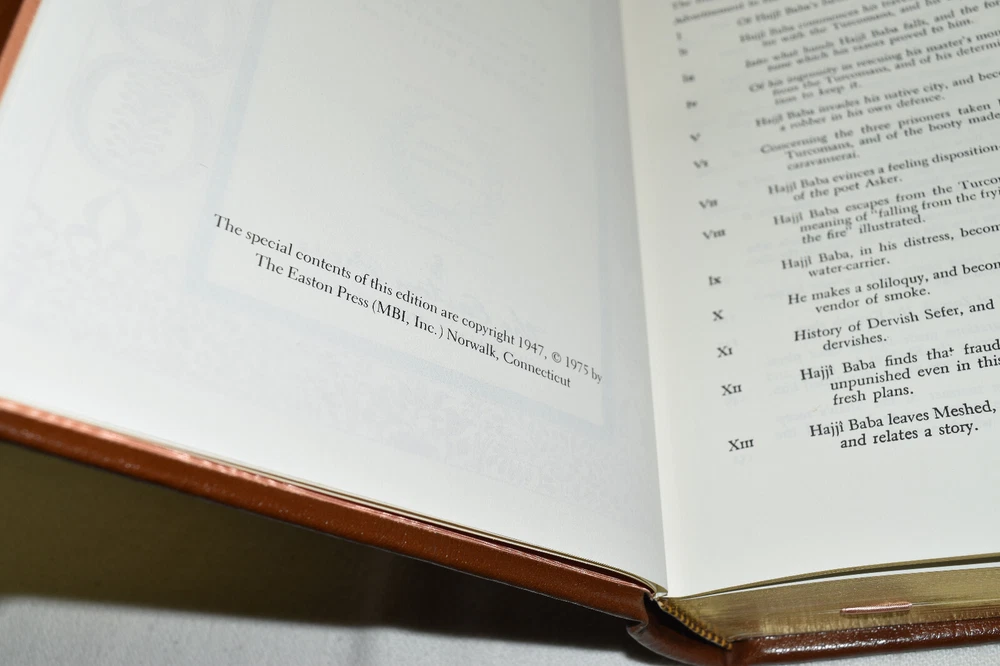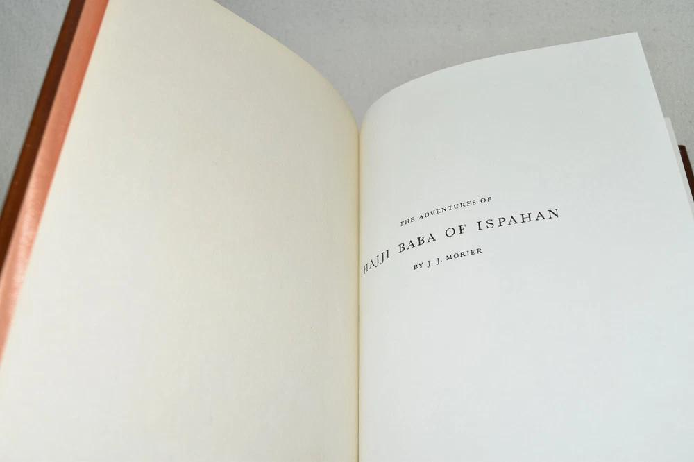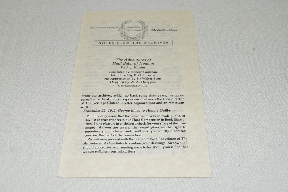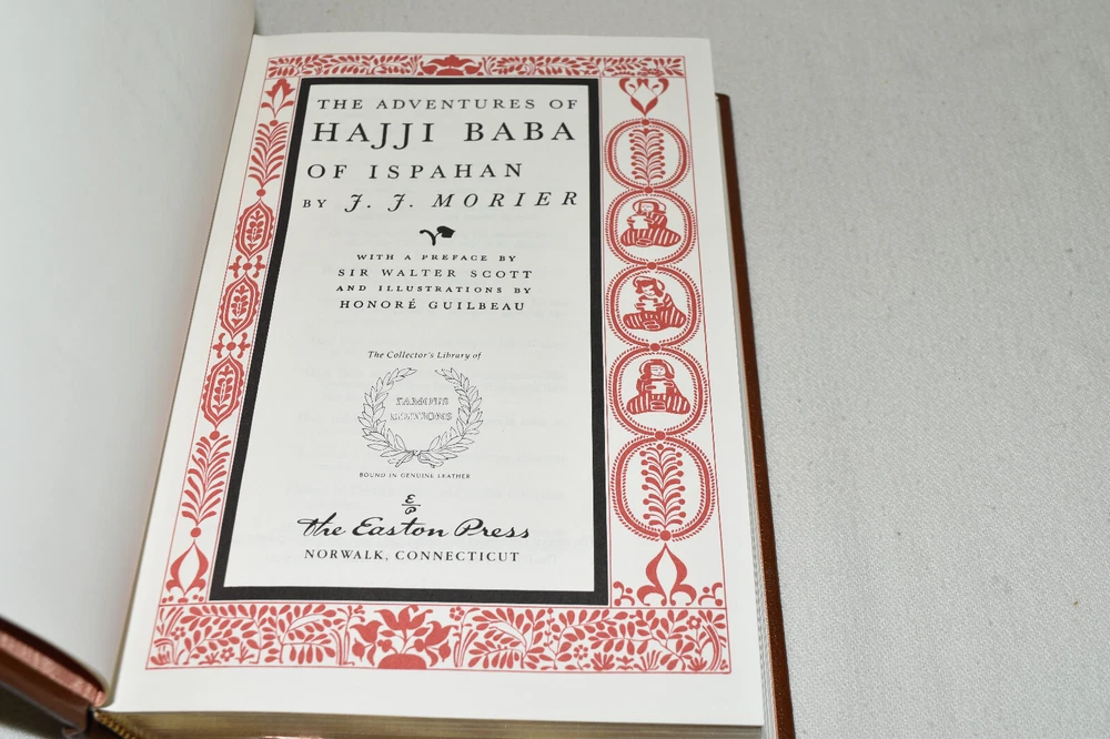 From the Easton Press Library of Famous Editions Collection... The Adventures of Hajji Baba of Ispahan by J. J. Morier Illustrated by Honore Guilbeau Preface by Sir Walter Scott Copyright 1975 by The Easton Press Bound in Premium Full Leather This volume contains all of the classic Easton Press trimmings: Premium Leather Silk Moire Endleaves Distinctive Cover Design Hubbed Spine, Accented in Real 22KT Gold Satin Ribbon Page Marker Gilded Page Edges Long-lasting, High Quality Acid-neutral Paper Smyth-sewn Pages for Strength and Durability Beautiful Illustrations A very scarce title in any condition, this volume is in Fine condition. The front and back covers are both in terrific condition and the gilded page edges show hardly any wear (see pictures of all edges). There is light residue on the second page. This book is part of the Library of Famous Editions Collection published by Easton Press. It comes complete with Collector's Notes and would be a beautiful addition to your Easton Press collection. Overall, this copy is a grade collector's book. This book is very elusive in this superior condition, as only a limited number of them were ever published, so now is the time to act. Hopefully you can add this book to your collection and enjoy it in the years to come... Please Email Me With Any Questions You Might Have! Shipping Info: Buyer to Pay Shipping and Handling International Bidders Pay Extra Shipping Seller Not Responsible For Uninsured Items Lost or Damaged in Mail Forms of Payment Accepted: Paypal Good luck and happy bidding! Powered by eBay Turbo Lister The free listing tool. List your items fast and easy and manage your active items.