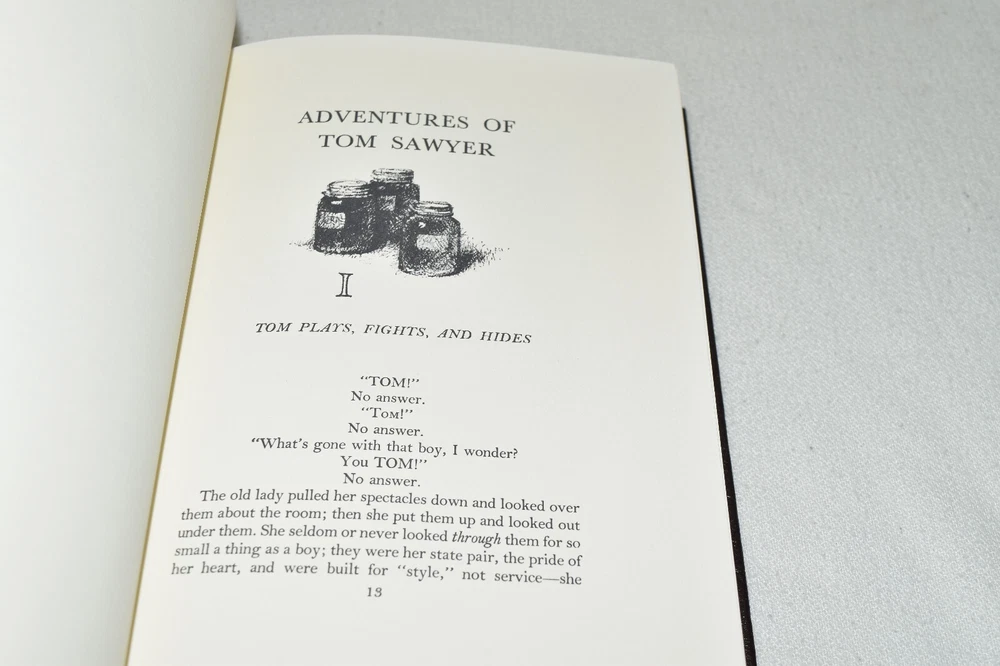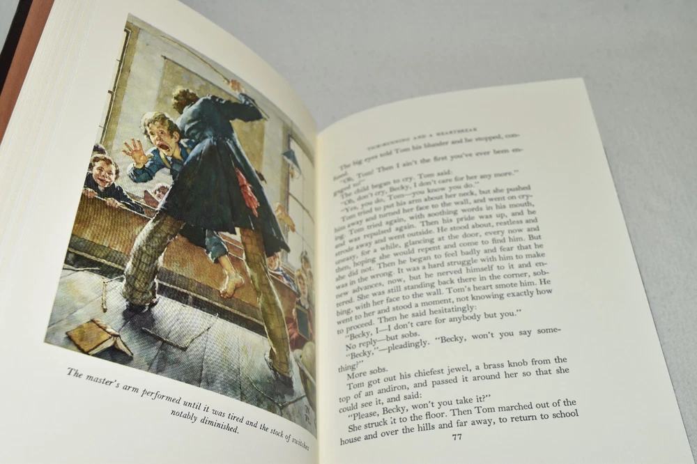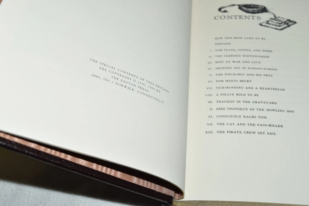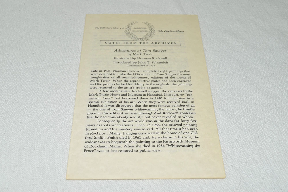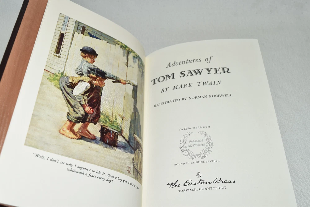 From the Easton Press Library of Famous Editions Collection... Adventures of Tom Sawyer by Mark Twain Introduced by John Winterich Illustrated by Norman Rockwell Copyright 1964 by The Easton Press Bound in Premium Full Leather This volume contains all of the classic Easton Press trimmings: Premium Leather Silk Moire Endleaves Distinctive Cover Design Hubbed Spine, Accented in Real 22KT Gold Satin Ribbon Page Marker Gilded Page Edges Long-lasting, High Quality Acid-neutral Paper Smyth-sewn Pages for Strength and Durability Beautiful Illustrations A very scarce title in any condition, this volume is in Fine condition. The front and back covers are both in terrific condition and the gilded page edges show hardly any wear (see pictures of all edges). There is faint residue on the second page. This book is part of the Library of Famous Editions Collection published by Easton Press. It comes complete with Collector's Notes and would be a beautiful addition to your Easton Press collection. Hopefully you can add this book to your collection and enjoy it in the years to come... Please Email Me With Any Questions You Might Have! Shipping Info: Buyer to Pay Shipping and Handling International Bidders Pay Extra Shipping Seller Not Responsible For Uninsured Items Lost or Damaged in Mail Forms of Payment Accepted: Paypal Good luck and happy bidding! Powered by eBay Turbo Lister The free listing tool. List your items fast and easy and manage your active items.