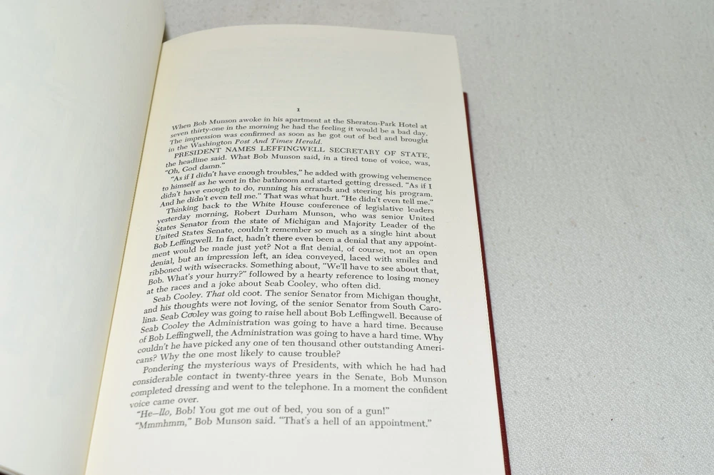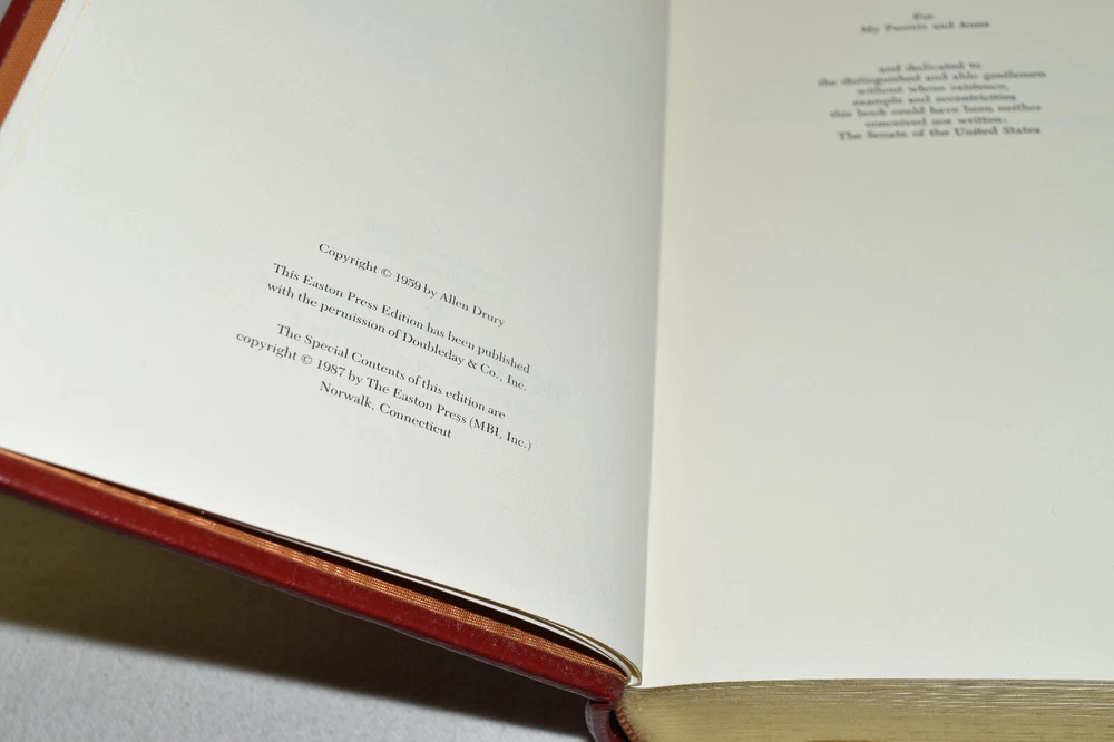 From the Easton Press Collection... Advise and Consent by Alan Drury Introduction by the Author C ollector's Edition Copyright 1987 by The Easton Press Bound in Premium Full Leather This volume contains all of the classic Easton Press trimmings: Premium Leather Silk Moire Endleaves Distinctive Cover Design Hubbed Spine, Accented in Real 22KT Gold Satin Ribbon Page Marker Gilded Page Edges Long-lasting, High Quality Acid-neutral Paper Smyth-sewn Pages for Strength and Durability Beautiful Illustrations A very scarce title in any condition, this Easton Press First Limited Edition is in Fine condition. The front and back covers are both in terrific condition and the gilded page edges show minor wear (see pictures of all gilt sides). There is faint residue on the second page. This book was published by Easton Press and would be a beautiful addition to your Easton Press collection. Hopefully you can add this book to your collection and enjoy it in the years to come... Please Email Me With Any Questions You Might Have! Shipping Info: Buyer to Pay Shipping and Handling International Bidders Pay Extra Shipping Seller Not Responsible For Uninsured Items Lost or Damaged in Mail Forms of Payment Accepted: Paypal Good luck and happy bidding! Powered by eBay Turbo Lister The free listing tool. List your items fast and easy and manage your active items.