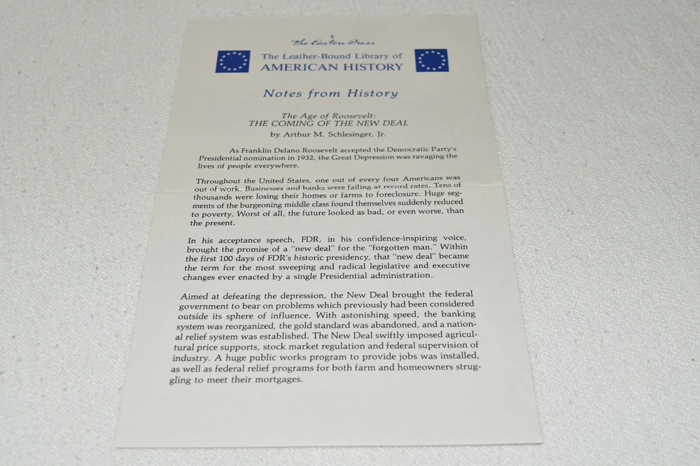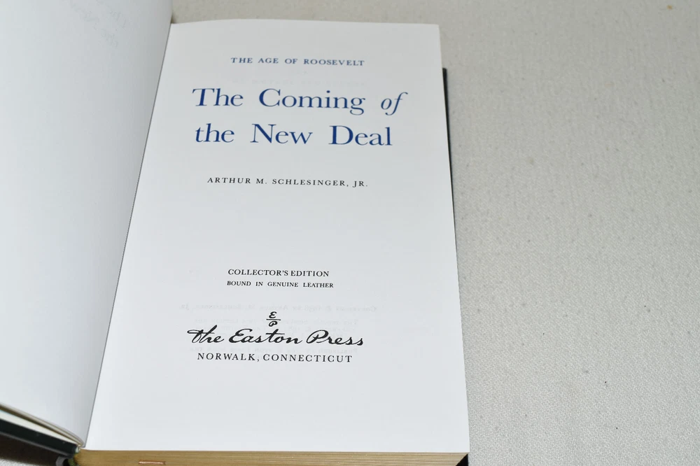 From the Easton Press Library of American History... The Age of Roosevelt The Coming of the New Deal by Arthur Schlesinger Jr. Collector's Edition Copyright 1987 by The Easton Press Bound in Premium Full Leather This volume contains all of the classic Easton Press trimmings: Premium Leather Decorated Endleaves Distinctive Cover Design Hubbed Spine, Accented in Real 22KT Gold Satin Ribbon Page Marker Gilded Page Edges Long-lasting, High Quality Acid-neutral Paper Smyth-sewn Pages for Strength and Durability Beautiful Illustrations A very scarce title in any condition, this Easton Press Edition is in Fine condition. The front and back covers are both in terrific condition and the gilded page edges show only minor wear (see pictures of all sides of gilt). There is faint residue on the second page. This book is part of the Library of American History Collection published by Easton Press. It comes complete with Collector's Notes and would be a beautiful addition to your Easton Press collection. Please Email Me With Any Questions You Might Have! Shipping Info: Buyer to Pay Shipping and Handling International Bidders Pay Extra Shipping Seller Not Responsible For Uninsured Items Lost or Damaged in Mail Forms of Payment Accepted: Paypal Good luck and happy bidding! Powered by eBay Turbo Lister The free listing tool. List your items fast and easy and manage your active items.